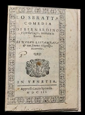 In 8° piccolo; 59, (1) pp. Legatura in cartoncino novecentesco. Esemplare leggermente corto di margini ma non rifilato. Una nota di possesso antica rifilata al margine basso. Marca tipografica al frontespizio con immagine dell'Umiltà, Donna che schiaccia con un piede il leone, in cornice figurata e motto "Sic omnia cedunt humilitati". Penultima edizione, l'ultima stampa è del 1608, di questa celebre commedia edita per la prima volta nel 1552. L'opera è stampata dallo stampatore veneziano Lucio Spineda. L'Abate Bernardino Pino da Cagli (Osimo ?, 1520-30 Cagli, 14 marzo 1601) è stato un celebre commediografo e letterato marchigiano. Nato in una famiglia originaria di Osimo, Bernardino si trasferì, a seguito della famiglia, nel piccolo centro di Cagli in tenera età. Per tutta la vita fu vicino ai duchi d'Urbino i Della Rovere sotto i quali fu anche a servizio, duchi che gli assegnarono anche un titolo di nobiltà. Beranrdino fu amico di Torquato Tasso e pur rimanendo per quasi tutta la sua vita isolato in quel di Cagli, intrattenne rapporti epistolari con numerose personalità letterarie del cinquecento come Dionigi Atanagi, Annibal Caro e Girolamo Muzio. Lo Sbratta, che è la sua prima commedia di successo, fu scritta in gioventù e rappresentata a Roma il 29 novembre 1551, per essere poi ristampata l'anno seguente. Nel 1581 fu allestita anche a Cagli. Opera assai rara.