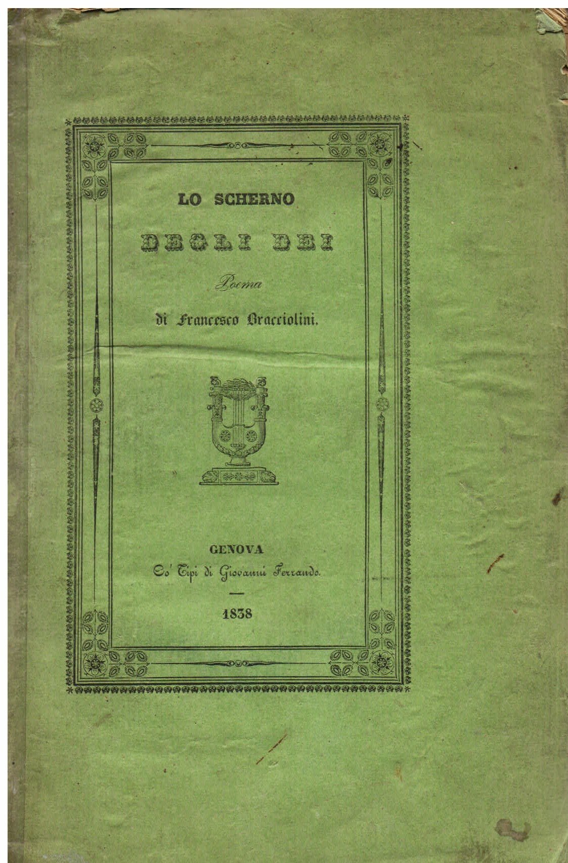 In-8°, pp. XVI, 304, brossura editoriale verde pistacchio con titolo e figura di una cetra entro bordura ornamentale. Ritratto dell'autore all'antiporta inciso su acciaio. Vignetta tipografica con immagine di Ermes al frontespizio. Precedono il testo del poema delle notizie biografiche sull'autore scritte da Giambattista Corniani. Piccoli restauri al dorso. Usuali bruniture. In barbe, in ottimo stato. Riedizione ottocentesca del famoso poema eroicomico di Francesco Bracciolini (Pistoia, 1566-1645). I primi 14 canti dell'opera apparvero nel 1618 a Firenze; gli ultimi 6, nell'edizione romana del 1626. Singolare divertissement letterario, il poema volle parodiare la mitologia e le divinità pagane, ritenute nocive alla vera religione ed è, con la 'Secchia rapita' del Tassoni, uno dei più cospicui esempi italiani in questo genere letterario. 'Se questo poema non può andar del pari in merito con quello della Secchia rapita, è sparso però di tali bellezze, che anche a' tempi nostri, in cui tanto è raffinato il gusto per la poesia, non lascia di piacere, se non altro, per lo scherzo sempre ben condotto e per quella facilità e leggiadria con cui l'autore seppe descrivere quello che gli venne nella fantasia' (dall'avvertenza editoriale). Il Bracciolini visse a Firenze, a Milano e a Roma, ricoprendo gli incarichi di segretario del cardinale Federico Borromeo, di Maffeo Barberini, futuro papa con il nome di Urbano VIII, e di Antonio Barberini. Fu autore di tragedie, di favole pastorali, di poemi di flagrante imitazione tassiana, estranei fondamentalmente al dominante gusto barocco del suo tempo. Edizione mancante al Gamba. Cfr. Enrico Alpino in Dizion. Bompiani delle Opere, VI, 559-560: '.Lunga infilata di parodie di miti famosi e di episodi grotteschi [che] ingenera assai presto sazietà nel lettore moderno, nonostante la facilità nel verseggiare e la vivacità di cui il Bracciolini dà prova.'.