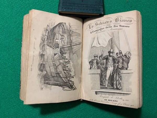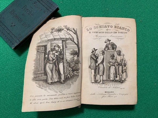 In 12°; due tomi in un volume: 249, (3) pp. e 4 c. di tav. fuori testo compresi l'antiporta ed il frontespizio incisi, 286, (2) pp. e 4 c. di tav. fuori testo compresi l'antiporta ed il frontespizio incisi. Bella legatura coeva in mezza-pelle scura con titolo, numeri dei volumi e filetti in oro al dorso. Un piccolo difetto alla parte bassa della cerniera del piatto anteriore. Piatti foderati con carta marmorizzata coeva, qualche strofinatura. All'interno in buone-ottime condizioni di conservazione. Traduzione di Gaspare Aureggio. Senza data ma 1825, la Libreria Viscontini non stampò nulla dopo il 1826. Prima edizione italiana, una seconda fu stampata solo nel 1853 da Borroni e Scotti, di questo romanzo "abolizionista", scritta dal noto giornalista, storico e scrittore americano, Richard Hildreth (Deerfield, Massachusetts 28 giugno 1807 - Firenze 11 luglio 1865). È meglio conosciuto per aver scritto una nota Storia degli Stati Uniti d'America in sei volumi che copre il periodo 1497-1821 che venne pubblicata nel 1840-1853. Gli storici la considerano una storia politica molto accurata della prima Repubblica ma con un forte pregiudizio a favore del Partito Federalista e dell'abolizione della schiavitù. L'autore frequentò la Phillips Exeter Academy, a partire dal 1816, e rimanendo per sette anni. Nel 1826 si laureò all'Harvard College. Dopo aver studiato legge a Newburyport, fu ammesso all'Ordine degli Avvocati di Boston nel 1830. Nel 1832, Hildreth divenne co-fondatore ed editore del quotidiano "Boston Atlas". Nel 1834, scrisse questo popolare romanzo contro la schiavitù "The Slave: or Memoir of Archy Moore" pubblicato nel 1836, poi ampliato nel 1852. Nel 1837 scrisse per l'"Atlas" una serie di articoli che si opponevano con forza all'annessione del Texas. Nello stesso anno pubblicò un importante scritto sulle banche e la valuta cartacea, opera che ha contribuito a promuovere la crescita del sistema bancario libero in America. Nel 1838 riprese i suoi doveri editoriali sull'Atlas, ma nel 1840 si trasferì, a causa della sua salute, nella Guyana britannica, dove visse per tre anni e fu redattore di due settimanali che uscivano in contemporanea a Georgetown. Nello stesso anno pubblicò in questo un volume in opposizione alla schiavitù, Dispotismo in America (2a ed., 1854). Tra il 1857 e il 1860 Hildreth lavorò per il New York Tribune e nello stesso periodo scrisse diversi trattati contro la schiavitù per il nascente partito repubblicano sotto vari pseudonimi. La cattiva salute lo costrinse a ritirarsi dalla sua carriera di scrittore nel 1860. In qualità di governatore del Massachusetts, Nathaniel Prentiss Banks e il senatore Charles Sumner, fecero pressioni per la nomina di Hildreth come console degli Stati Uniti a Trieste, carica che ottenne, nel 1861. Nel 1865 si dimise da quella posizione e si trasferì a Firenze, dove morì l'11 luglio 1865. È sepolto vicino a Theodore Parker nel Cimitero degli Inglesi, Firenze. Questa prima edizione italiana è assai rara.
