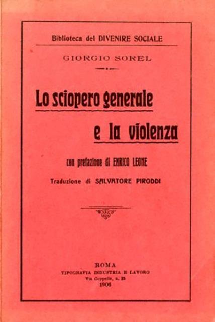 Reprint a cura di Roberto Gabriele. X, 127 p. ; 18 x 12 cm. Biblioteca del Divenire sociale. Georges Sorel, teorico del sindacalismo rivoluzionario, in questo testo teorizza lo sciopero generale come mito nel quale si racchiude tutto intero il socialismo, ossia un'organizzazione d'immagini capaci di evocare istintivamente tutti i sentimenti corrispondenti alle diverse manifestazioni della guerra ingaggiata dal socialismo contro la società moderna. Esalta, inoltre, la violenza - ma in difesa dell'individuo contro lo Stato - e teorizza lo sciopero proletario come strumento di lotta per la rivoluzione da parte dei liberi individui che si uniscono in masse insorte. Gli scritti raccolti in questo opuscoli vennero pubblicati per la prima volta nella rivista «Divenire Sociale», e poi furono riprodotti dal «Mouvement Socialiste» in Francia. Prefazione di Enrico Leone, traduzione di Salvatore Piroddi. Reprint a cura di Roberto Gabriele (stampato nei primi anni settanta del '900). Brossura editoriale, coperta in cartoncino flessibile di colore rosso. Codice libreria 9541.