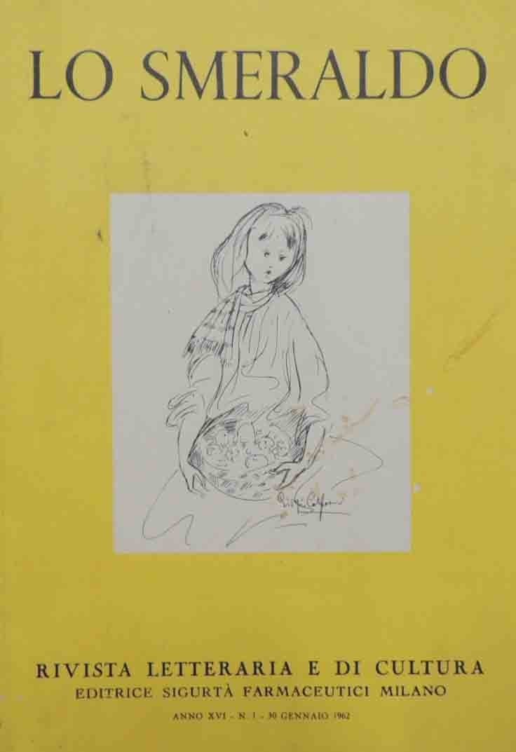 Lo smeraldo. Rivista letteraria e di cultura, Editrice Sigurtà Farmaceutici, Milano, anno XVI, numero I, 30 gennaio 1962, pp. 31, ill. b.n., 4 c. di tavv. f.t. ill. b.n., cm 28, br. ed. Indice: Francesco Serantini, Vento nel bosco – Paolo Cesarini, Avventura sepolta – Diego Valeri, Mollior aestas (lirica) – Enrico Falqui, Il giornale e la terza pagina – Lucio Ridenti, Miracolo a Napoli – Nino Palumbo, Scuola serale – Discoteca, a cura di Dario Cartago. In copertina, disegno di G. Carpanini. Leggere tracce d’uso, brossura un po’ sporca, ma nel complesso buona copia.