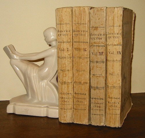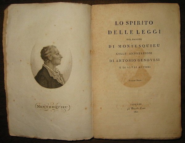 8vo (cm. 21,6), 4 Voll., XLV(1) pp., 270 pp.; 320 pp.; 314 pp.; 285(3) pp. Nel primo volume il ritratto in antiporta di Montesquieu e, dopo la prefazione, quello di Antonio Genovesi. Brossure editoriali in cartoncino grigio con copertine anteriori xilografiche raffiguranti un angelo che suona la tromba in volo su di un leone accucciato. Qualche imperfezione, ma esemplare in barbe in buono stato di conservazione. Rara traduzione in italiano dell’opera più conosciuta di Montesquieu, arricchita in particolare dalle annotazioni dell’Abate Antonio Genovesi.