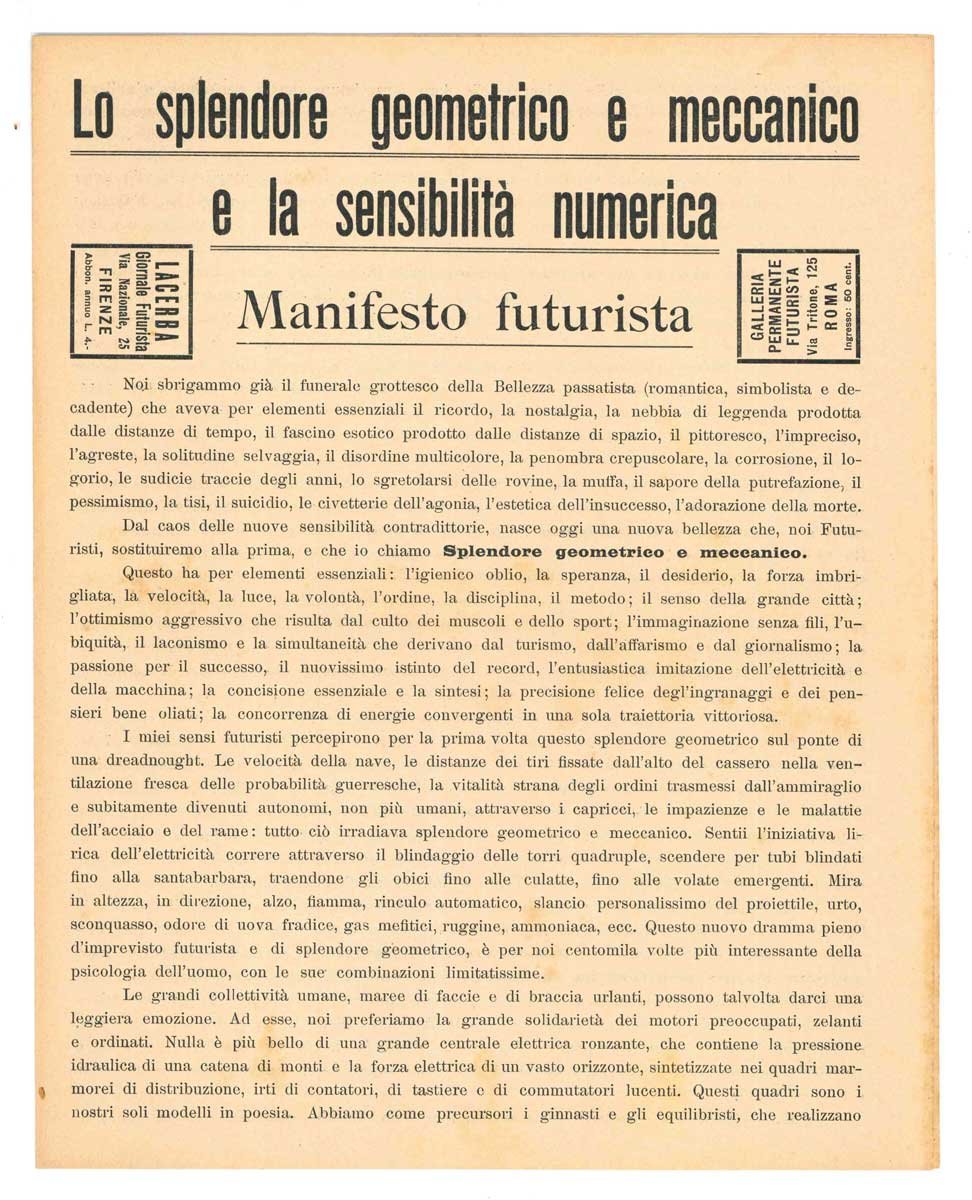 Lo splendore geometrico e meccanico e la sensibilità numerica. Manifesto futurista