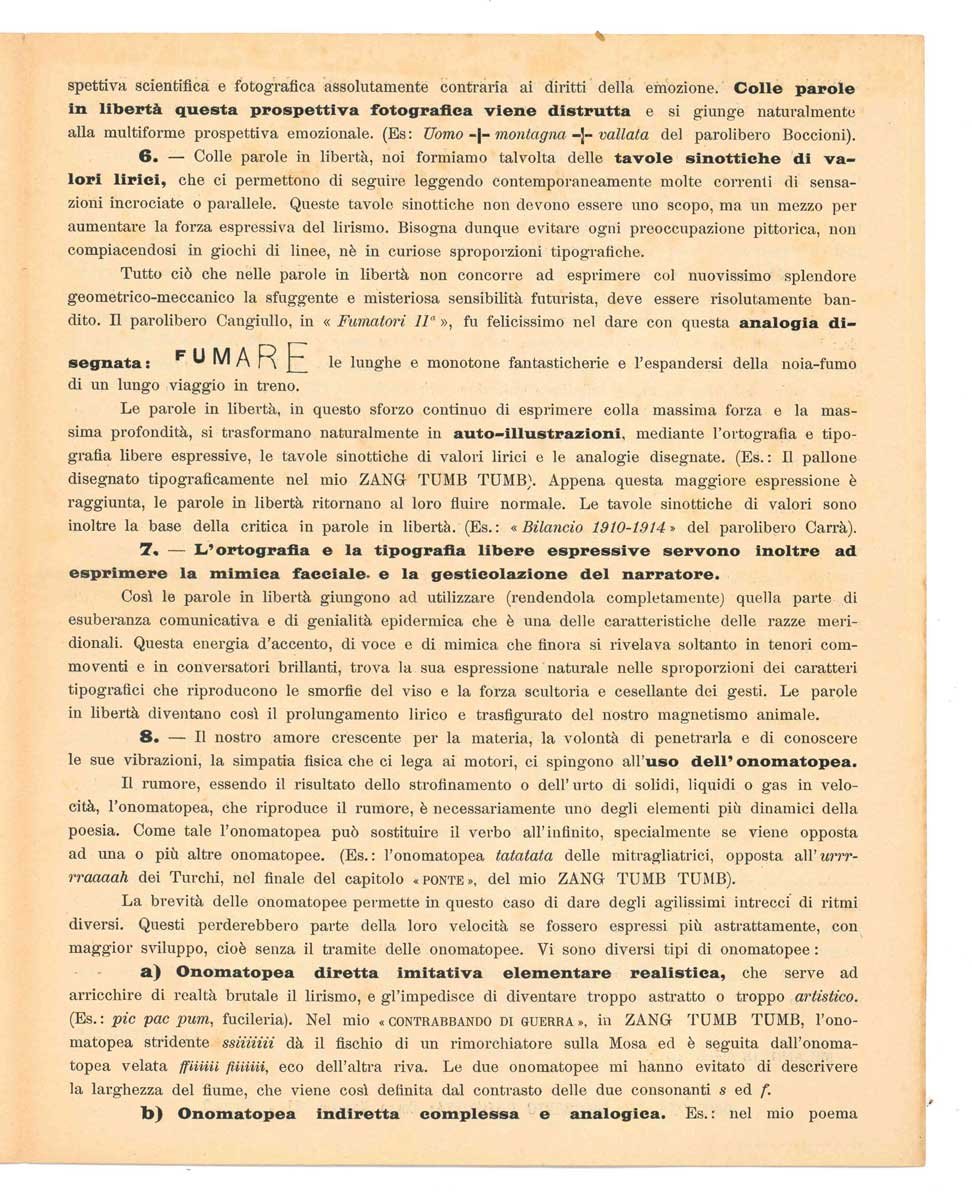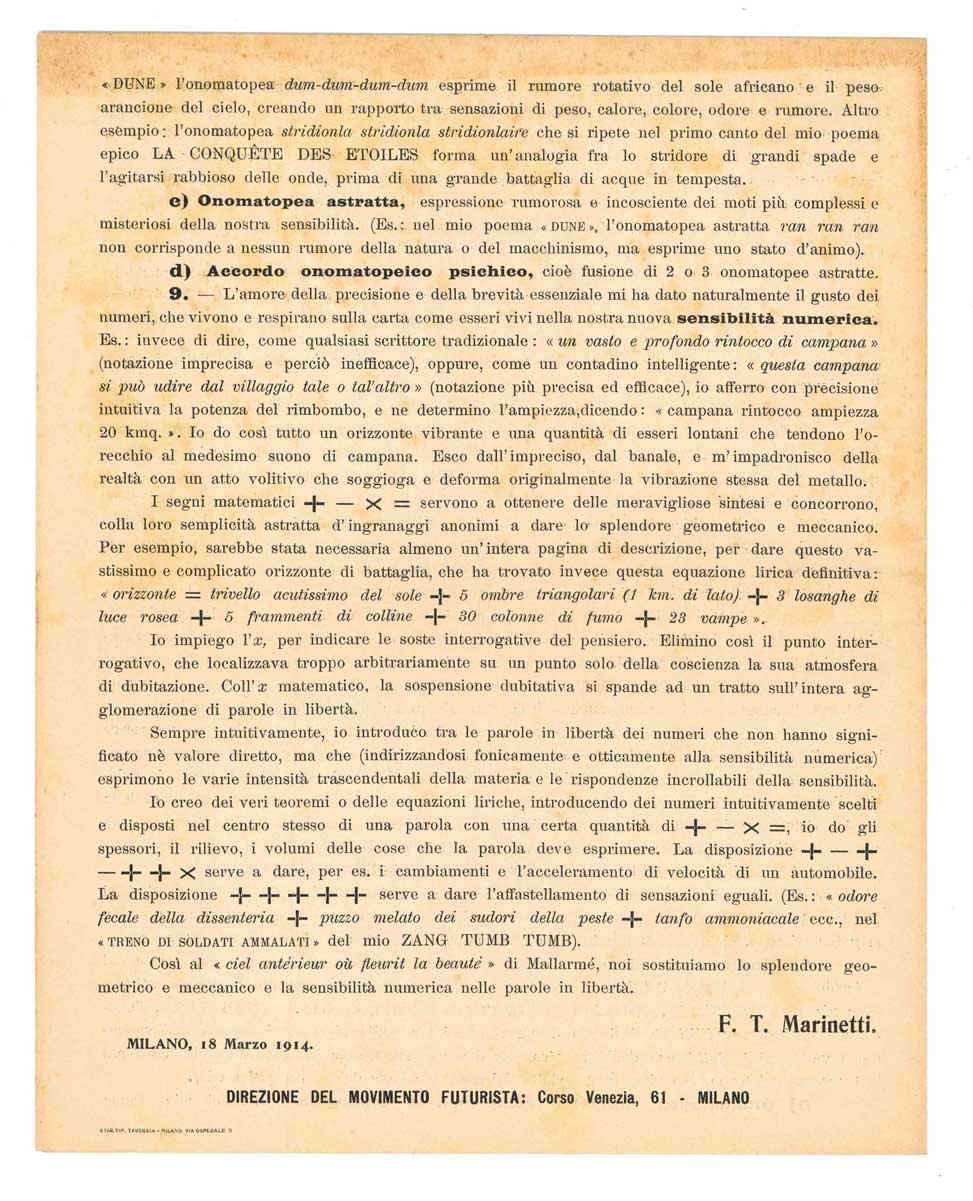 MANIFESTONon comune prima edizione autonoma in italiano (il testo apparve in due parti su Lacerba II/6 e 7). La distribuzione del manifesto avvenne in aprile, come attesta una lettera di Marinetti a Pratella datata 14 aprile: «Scrivimi ciò che pensi del mio ultimo manifesto qui unito» (Archivi del futurismo 1, p. 328). Tonini, I manifesti del futurismo, n. 76.4