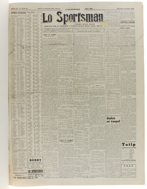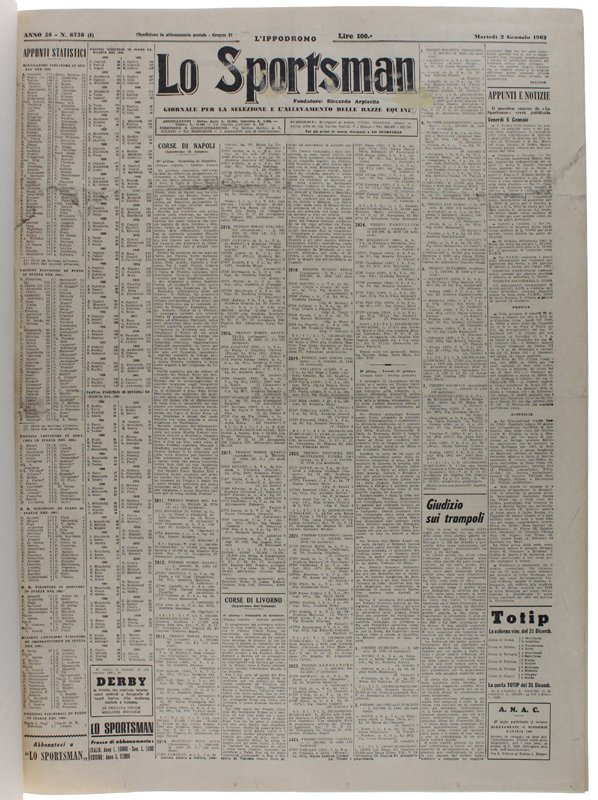 (Codice CA/0470) In folio (58 cm) Raccolta completa, dal n. 6736 del 2 gennaio al n. 6859 del 28 dicembre. Intercalati 18 PROGRAMMI UFFICIALI. Solida legatura dell'epoca, mezza tela, tassello, titolo oro. In ottimo stato. ~~~ SPEDIZIONE IN ITALIA SEMPRE TRACCIATA