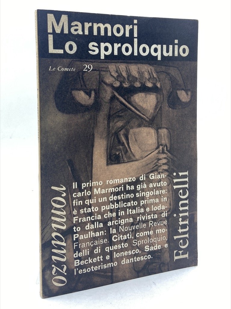 Brossura editoriale illustrata, cm 20.5 x 12.5, pp 94 (2). Collana Le Comete, numero 29. Prima edizione italiana del primo romanzo di Giancarlo Marmori, apparso l’anno precedente in Francia col titolo «La parlerie». Copertina, di U. Brandi, con un’opera di Roberto Matta e sul piatto posteriore una fotografia dell’autore a Parigi, scattata da Pablo Volta.
