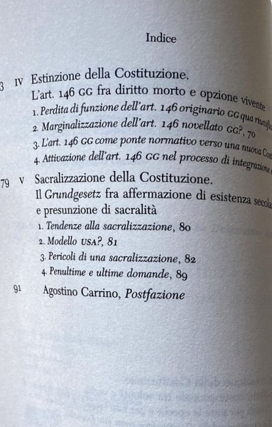 Soggetti: Filosofia politica Struttura e processi politici Diritto Pubblico Costituzione Governo Stato moderno Legge fondamentale Volontà Stati Uniti d'America Revisione costituzionale Germania Articolo 79 comma 3 Costituzione federale tedesca Identità Rottura Norme Legge naturale Emendamenti Distruzione Repubblica di Weimar Democrazia Eccezione Diritti umani Estinzione Articolo 156 Europa Integrazione Unione europea Riforme Grundgesetz Sacralità Potere costituente Sacralizzandone Hans Kelsen Carl Schmitt Leviatano Decisionismo giuridico Nazismo Terzo Reich Thomas Hobbes Pufendorf Otto Hintze Messner Verfassunggebung Verfassungsänderung Hasso Hofmann Federalist Papers James Madison Josef Isensee Parlamentarischen Rates Paul Kirchhof Thomas Jefferson Pouvoir constituant Weimarer Reichsverfassung Naturrecht Richard Thoma Leggi fondamentali Legislazione Teorie e scienze politiche Political Philosophy Political Structure and Processes Law Constitution Government Modern State Basic Law Will United States Constitutional Review Germany Article 79 Paragraph 3 German Federal Constitution Identity Breakage Rules Natural Law Amendments Destruction Republic Democracy Exception Human Rights Extinction Europe Integration European Union Reforms Sacredness Constituent Power Sacralizing Legal Decision-Making Nazism Third Reich Basic Laws Legislation Political theories and sciences Libri Vintage Fuori catalogo Out of print Books Legal Studies Collezionismo Collectibles