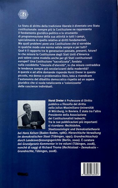 Lo Stato di diritto della tradizione liberale è diventato uno Stato costituzionale: sempre più la Costituzione ne rappresenta il fondamento giuridico-politico e lo strumento di programmazione della sua attività in tutti i campi, specialmente in quello relativo ai diritti fondamentali. Ma quali problemi pone una Costituzione che si vorrebbe in qualche modo una norma valida sempre e per tutti? Qual è il rapporto tra le generazioni passate, presenti, future? In che misura la Costituzione degli Stati Uniti d'America può valere come modello anche per gli Stati costituzionali europei? Una Costituzione sacralizzata, fondata sulla cosiddetta clausola d'eternità, in che misura contraddice le tendenze sempre più secolarizzanti della modernità? A queste e ad altre domande risponde H. Dreier in questo piccolo, ma denso e problematico libro, teso a rivendicare l'autonomia del dibattito democratico rispetto ad un sapere giuridico che si vuole totalizzante e colonizzante delle coscienze individuali.