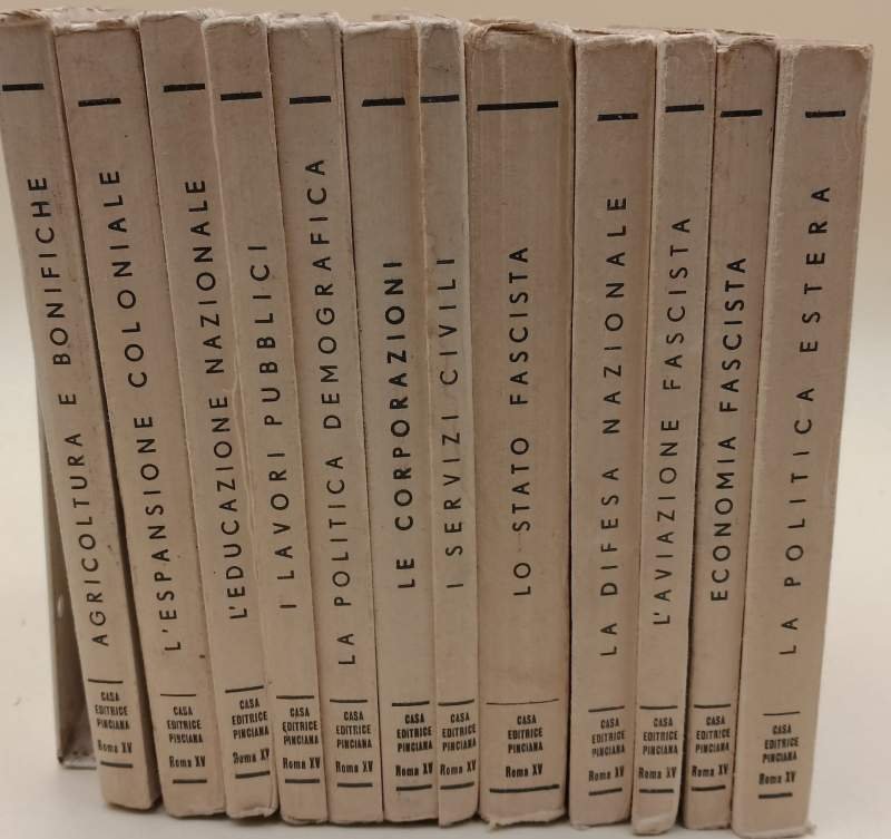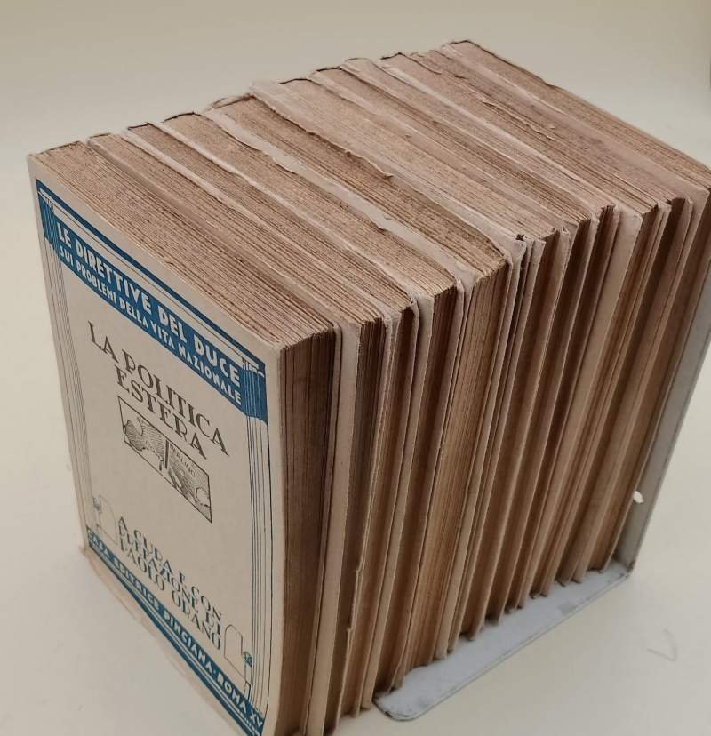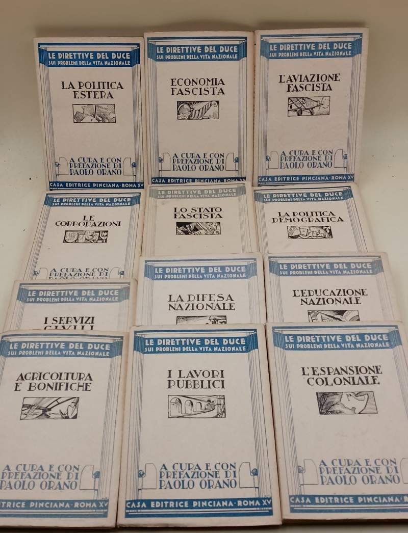 12 voll., in 8', br. ed., della collana "Le direttive del duce sui problemi della vita nazionale": L'espansione coloniale, Lo stato fascista, La politica demografica, Economia fascista, Le corporazioni, La politica estera, La difesa nazionale, I lavori pubblici, Agricoltura e bonifiche, I servizi civili, L'aviazione fascista, L'educazione nazionale. Volumi intonsi, tranne "Lo stato fascista", con pieghe agli angoli sup., complessivamente in buono stato, fioriture e segni del tempo, tracce di umidita' al margine sup. de " I servizi civili". ***Due to bureaucratic reasons, books dated over 70 years old cannot be immediately exported, please contact us before placing the order.***