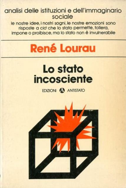 259 p. ; 19 x 12 cm. Segno libertario, 3. Nel momento in cui la forma-stato passa a scala mondiale, si scopre che l'inconscio, in ultima analisi, è lo stato. Le nostre idee, i nostri sentimenti, le nostre emozioni sono comandate dallo Stato. I suoi desideri sono ordini: le nostre non sono che risposte ubbidienti a ciò che esso permette, tollera, impone o proibisce. Tuttavia nulla ci vieta di pensare che questa super-istituzione non sia poi così invulnerabile come per molto tempo s'è creduto. In questa opera Lourau riscopre la prospettiva anarchica. Traduzione dal francese di Leonardo Bettini. Brossura editoriale, coperta illustrata a colori in cartoncino flessibile plastificato lucido. Titolo impresso al piatto e al dorso. Qualche leggero segno del tempo al taglio e ai risvolti (ingiallimento della carta), per il resto libro integro. Codice libreria 8562.