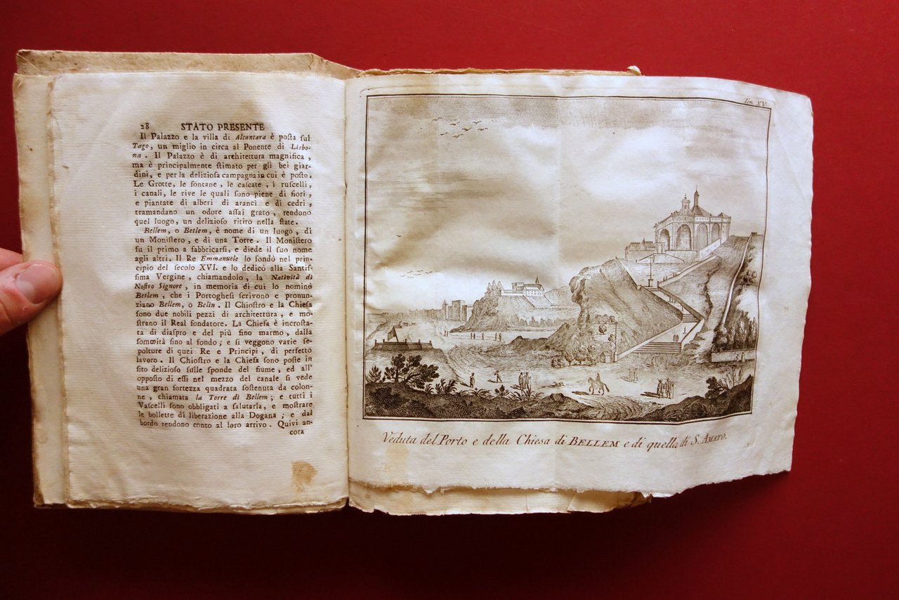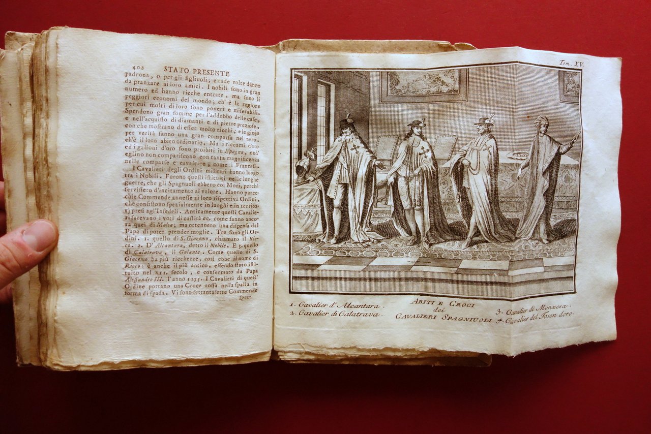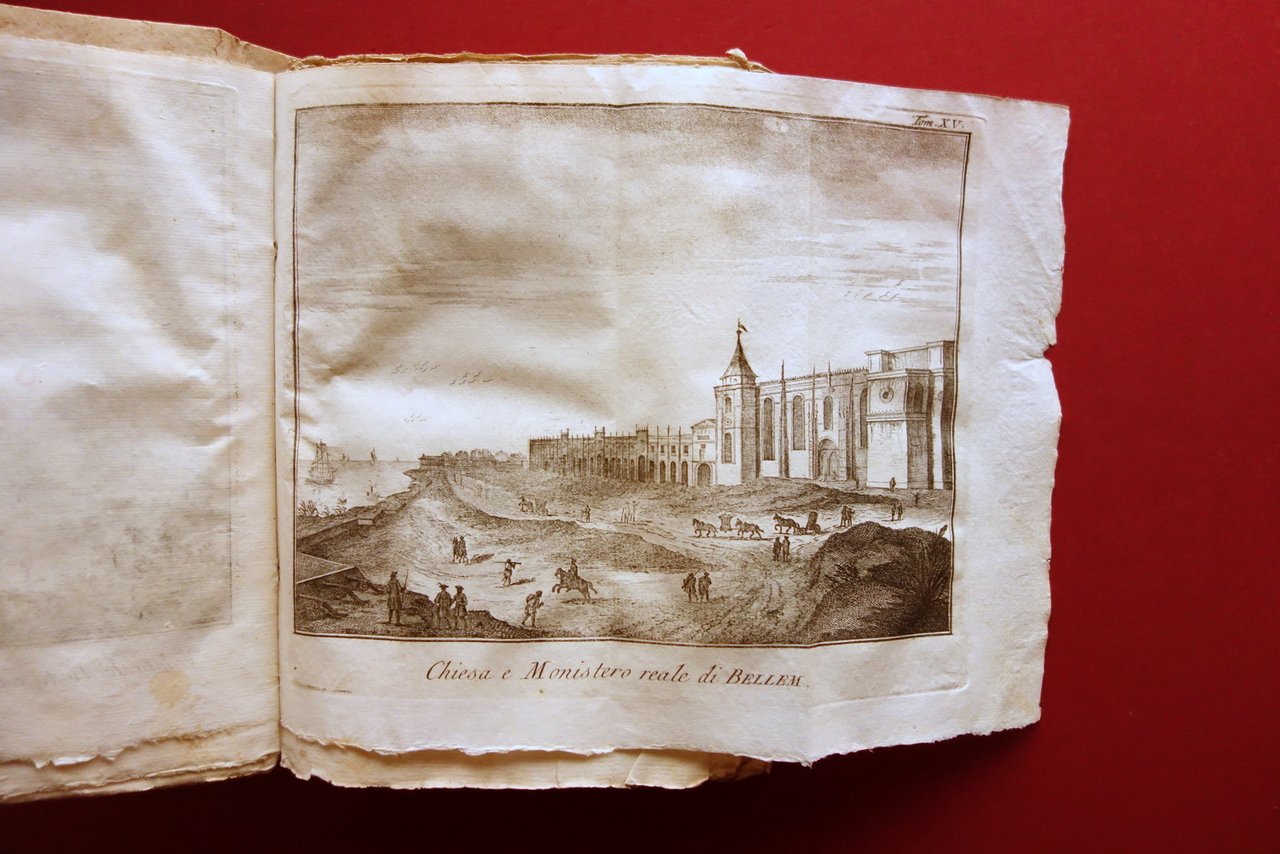 Volume XV, dedicato interamente al Regno di Portogallo, corredato da 4 belle tavole incise in bianco e nero, più l'antiporta, sulle 14 totali indicate al registro delle tavole. Di seguito l'elenco delle tavole presenti: "Veduta del porto e chiesa di Belem"; "Chiesa e monastero reale di Belem"; "Ordini dei Cavalieri di Portogallo"; "Abiti e croci dei cavalieri spagnoli".