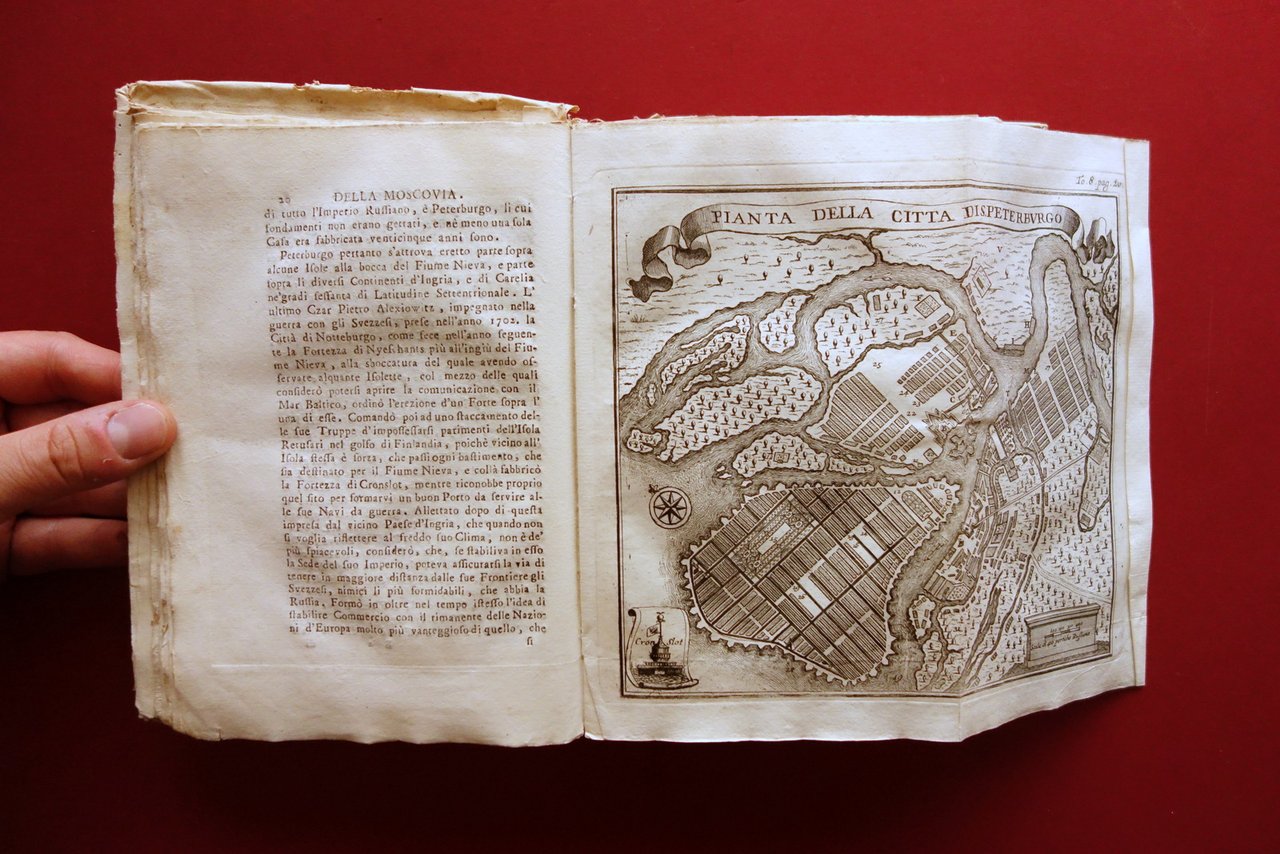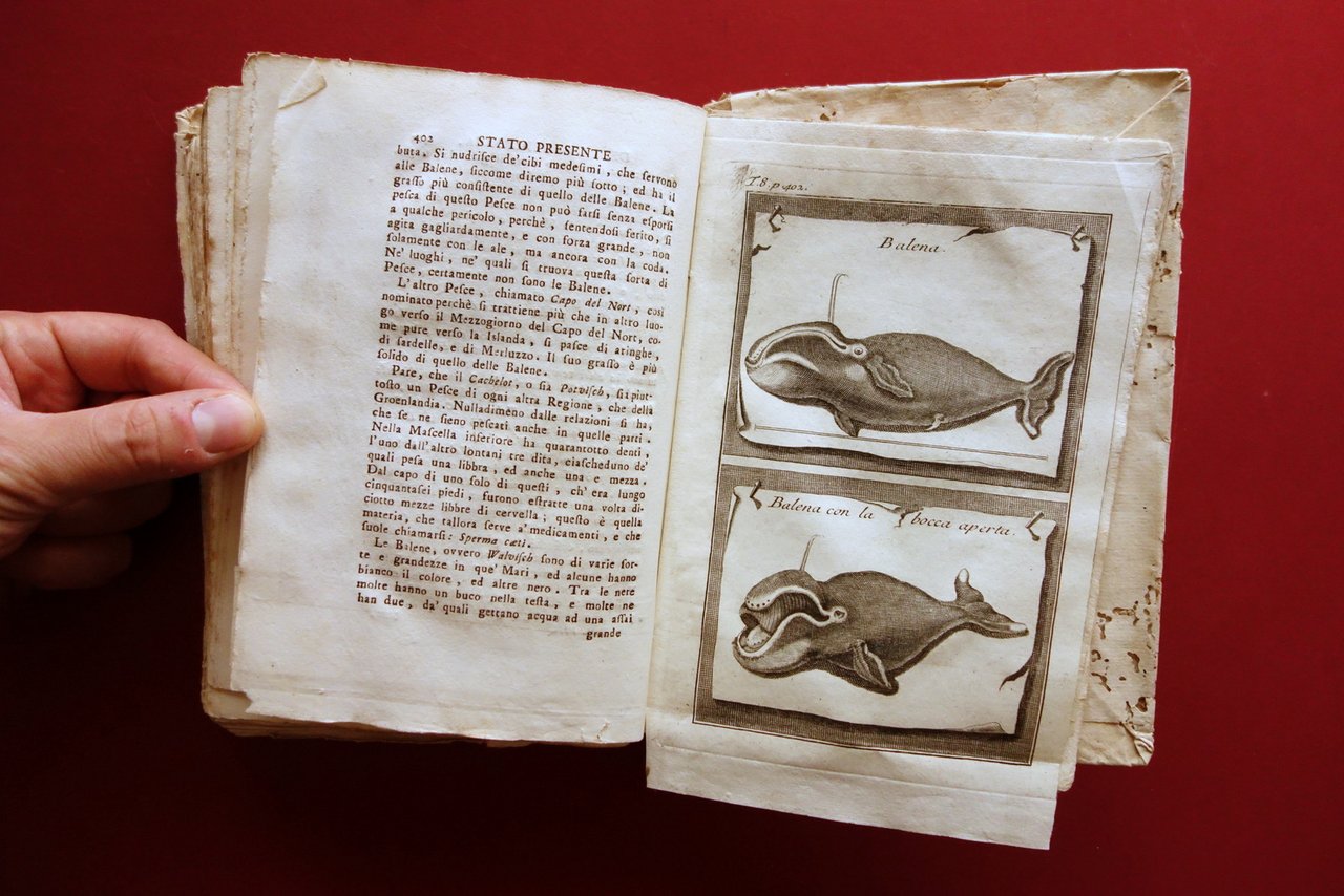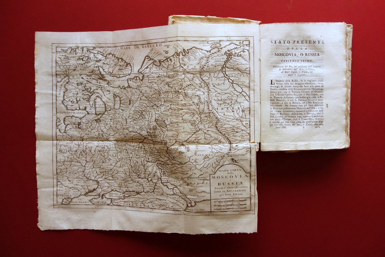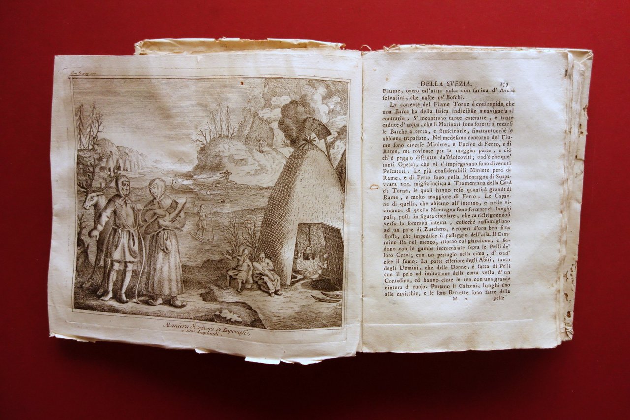Volume VIII, dedicato alle popolazioni settentrionali, corredato da 9 belle tavole incise in bianco e nero, più l'antiporta, sulle 18 totali indicate al registro delle tavole. Di seguito l'elenco delle tavole presenti: "Grande carta della Russia"; "Pianta della città di S. Pietroburgo"; "Abito antico delle donne, e delle Cittelle di Russia"; "Vestito degli antichi Czari di Moscovia"; "Maniera di vivere de' Laplandi Svezzesi"; "Ritratto di Carlo XII, Re di Svezia"; "L'Aletta ed il Cachelot"; "Balene"; "Sposo e sposa moscoviti".