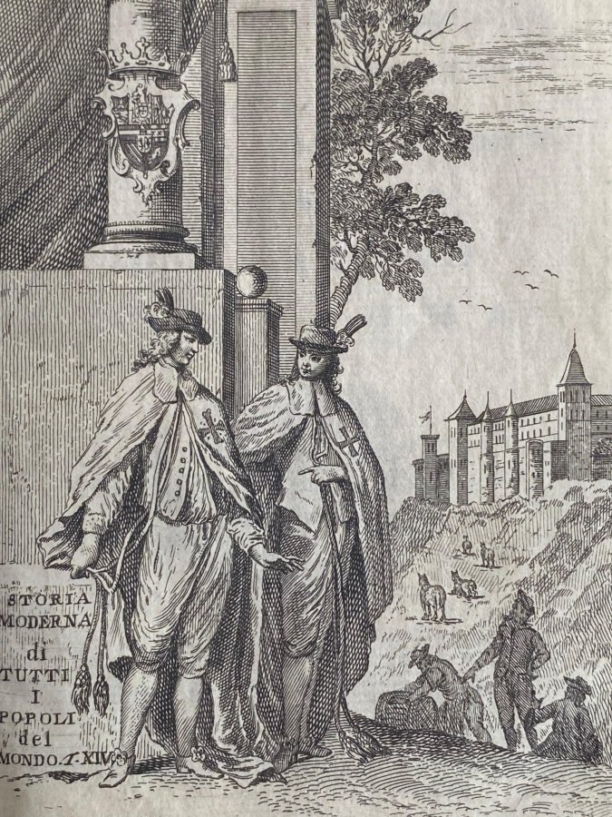 <font face="Arial, Verdana" size="2">In-8° (cm. 18,7), legatura coeva in piena pergamena con titolo in oro su tassello (lievi segni d'usura), tagli spruzzati in blu; pp. [16] 464 in ottimo stato (lievi fioriture sparse); con 1 tavola incisa in rame all'antiporta nel testo e 22 (di 23) tavole illustrative sempre in rame ripiegate fuori testo, di cui 1 grande carta geografica (mancante la veduta del Palazzo Reale di Madrid; tavola con Ingresso e Facciata dell'Escuriale mutila). Volume dedicato al nobile bolognese Francesco Malvezzi Angelelli; facente parte della monumentale impresa editoriale dell'Albrizzi, che progettò in lingua italiana la pubblicazione della </font><i style="font-family: Arial, Verdana; font-size: 10pt; font-variant-caps: normal; font-weight: normal;">Modern History or the Present State of all Nations</i><font face="Arial, Verdana" size="2"> del geografo inglese. Esemplare molto buono. (SB1)</font>