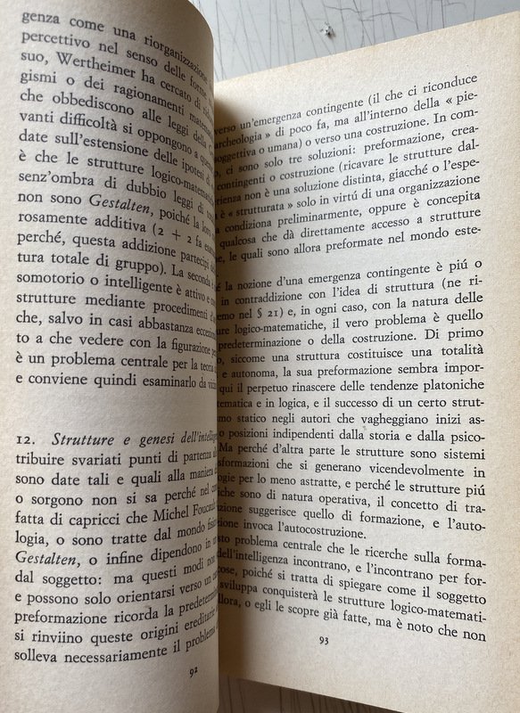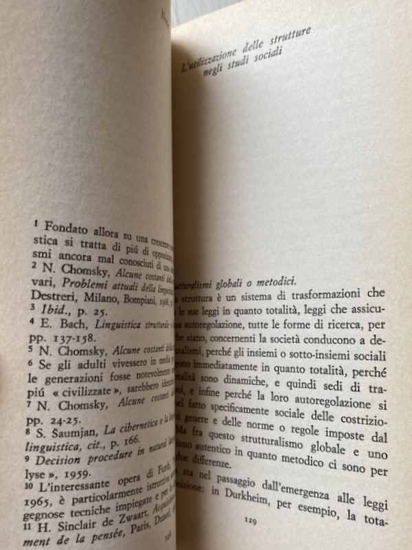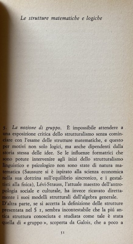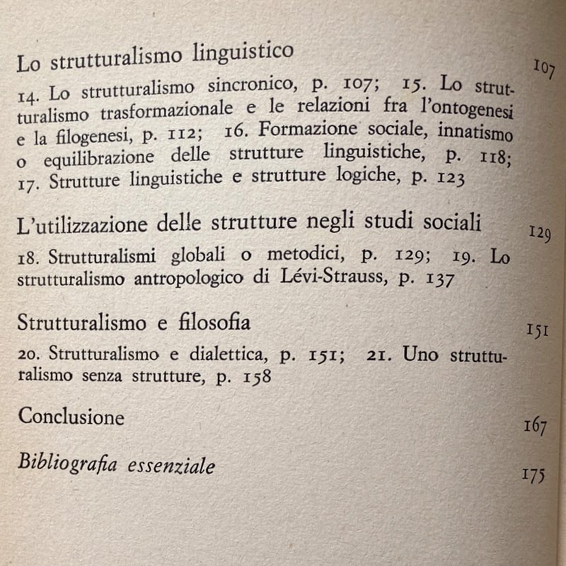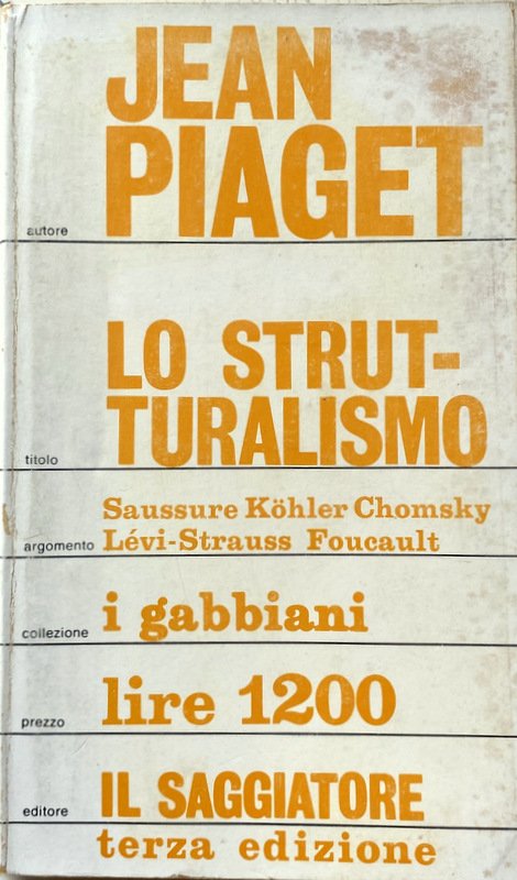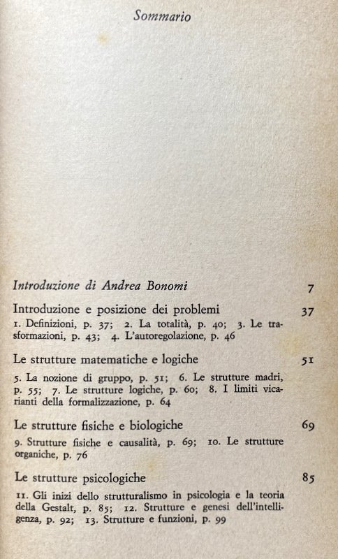Soggetti: Scienze umane, Psicologia sociale, Antropologia culturale, Epistemologia, Linguistica, Gestalt, Ferdinand De Saussure, Wolfgang Köhler, Noam Chomsky, Claude Lévi-Strauss, Michel Foucault, Vygotsky, Dibattiti, Scuole di pensiero, Cours, Corso, Lezioni, Saggistica, Tullio De Mauro, R. Engler, Critica, Storia, Società, Scienze sociali, Sociologia, Semiologia, Euristica, Aufhebung, Hegel, Louis Trolle Hjelmslev, Induzione, Teorie, Condizionamento, Metodo, Analisi, Logica, Glossemi, Edmund Husserl, Grammatica, Conoscenza, Struttura, Linguaggio, Gestalten, Kurt Gödel, Roman Jakobson, Ernst Cassirer, Trasformazioni, Matematica, Strutture logiche, Fisica, Equilibrio, Algebra, Évariste Galois, H. Sinclair de Zwart, Intelligenza, Émile Durkheim, Studi sociali, Viggo Carlo Tagliavini Brondal, Ontogenesi, Lewin, Jean Piaget, André Martinet, Max Planck, Jan Tinbergen, Ernest Nagel, Umberto Eco, Jacques Lacan, Giulio Ciro Lepschy, Talcott Parsons, Louis Althusser, Thomas Samuel Kuhn, Charles Darwin, Bibliografia, Riferimento, Classici, Manuali, Libri Vintage fuori catalogo, Collezionismo, Definizioni, Autoregolazione, Limiti, Formalizzazione, Biologia, Filogenesi, Innatismo, Dialettica, Sviluppo, Lev Semënovic Vygotskij, Adattamento, Apprendimento, Bambini, Infanzia, Anni Sessanta, Anni Settanta, Pedagogia strutturalista, Filosofia, Cultura, Novecento, Lingua, Volontà, Structuralism, Marxismo, Relazioni, Interazioni, Apprendimento, Capacità, Connessioni, Meccanismi mentali, Educazione, Organizzazione cognitiva, Operazioni, Boolean, Nicolas Bourbaki, Positivismo logico, Dialettica, Costruttivismo, Comportamento, Omeostasi, Leggi di composizione, Norme, Genetica, Organismi, Savage Mind, Limiti, Formalizzazione, Percezione, Astrazione riflessiva, Mentalità primitiva, Terrence William Deacon, Antoine Arnauld, Associazionismo, Charles Sanders Peirce, Fichte, Fermat, Hans Kelsen, Kant, Funzione simbolica, Simbolismo, Libri universitari, Umanistica, Semiotica, Human sciences, Social psychology, Cultural anthropology, Epistemology, Linguistics, Debates, Schools of thought, Courses, Lessons, Non-fiction, Criticism, History, Society, Social sciences, Sociology, Semiology, Heuristics, Induction, Theories, Conditioning, Method, Analysis, Glossemes, Grammar, Knowledge, Structure, Language, Transformations, Mathematics, Logical Structures, Physics, Equilibrium, Intelligence, Social Studies, Ontogeny, Bibliography, Reference, Classics, Manuals, Out of Print Books, Collecting, Definitions, Self-Regulation, Limits, Formalization, Biology, Phylogeny, Innatism, Dialectic, Development, Adaptation, Learning, Children, Childhood, Sixties, Seventies, Structuralist Pedagogy, Philosophy, Culture, Twentieth Century, Language, Will, Marxism, Relations, Interactions, Learning, Ability, Connections, Mechanisms mental, Education, Cognitive organization, Operations, Logical positivism, Dialectic, Constructivism, Behavior, Homeostasis, Laws of composition, Norms, Genetics, Organisms, Limits, Formalization, Perception, Reflective abstraction, Primitive mentality, Associationism, Symbolic function, Symbolism, Books academics, Humanities, Semiotics, Der Strukturalismus