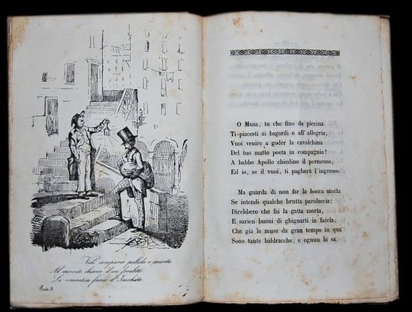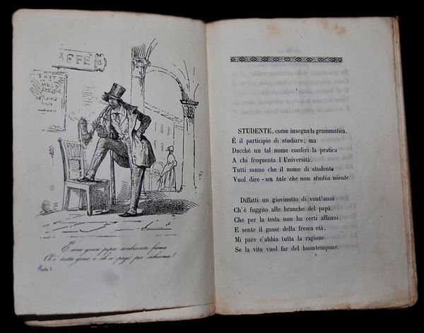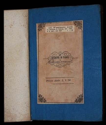 In 8° (22,5x15,4 cm); (4), 68, (4) pp. e 3 c. di tav. fuori testo. Brossura editoriale (piatto anteriore e posteriore) conservata entro seconda brossura coeva marmorizzata con titolo chiosato da mano ottocentesca al dorso. Frontespizio Inciso. Qualche lieve foxing ma nel complesso esemplare in più che buone condizioni di conservazione ancora in barbe ed ad ampi margini. Prima edizione non comune, pubblicata come monografia a se' stante (il componimento comparve per la prima volta sul giornale "Il caffè Pedrocchi"), di questo componimento poetico del celebre poeta e patriota italiano Arnaldo Fusinato (Schio in provincia di Vicenza, 25 novembre 1817 - Verona, 28 dicembre 1888). Il componimento è una satirica descrizione della vita degli studenti padovani con riferimenti agli amici di Fusinato ed agli angoli della città da lui frequentati come il Caffè Pedrocchi. Le tavole furono realizzate dal Sig. Cav. Paoletti come specificato nell'ultima carta dallo stesso Fusinato. "Durante gli anni universitari egli frequentò il Caffè Pedrocchi e l'osteria del Leon bianco con i poeti Giovanni Prati e Aleardo Aleardi, studenti di legge come lui. Fu più volte a Castelfranco Veneto dove nel 1840 divenne socio dell'Accademia dei Filoglotti. Nel 1841 pubblicò a Udine il suo primo libro di poesie: "Il sale ed il tabacco, cicalata ". Agli anni studenteschi risalgono anche numerose sue poesie giocose e romantiche. Collaborò al giornale "Caffè Pedrocchi", richiamando così su di sé l'attenzione della polizia austriaca. La situazione politica e culturale di quegli anni era infatti caratterizzata dalla mancanza di libertà, specialmente per gli intellettuali ed i personaggi non strettamente conformi al pensiero politico dominante. Al 1839 risale un episodio che lo avrebbe visto, insieme con il fratello minore Clemente, battersi di notte a randellate contro militari croati; ferito alla gola, egli riuscì a fuggire, mentre il fratello venne arrestato e temporaneamente sospeso dall'università. Dopo la laurea tornò a Schio per il praticantato nello studio del padre, senza però un vero interesse per la professione; continuò la collaborazione con il "Caffè Pedrocchi", pubblicando satire in versi come "Fisiologia del lino" e "Lo studente di Padova". Nel marzo del 1848 insorsero le città del Lombardo Veneto, costringendo alla ritirata le guarnigioni austriache. L'allora trentenne Fusinato costituì a Schio un "Corpo franco di Crociati", al comando di circa duecento volontari, compiendo alcune azioni in Vallarsa. Il 17 e 18 marzo insorse anche la città di Vicenza; Arnaldo Fusinato, dopo aver combattuto nella battaglia di Sorio, fu in prima fila a combattere per la difesa della città assediata, presidiando con la sua compagnia nella giornata del 24 maggio il colle dei Setteventi. Tutto fu vano e Vicenza dovette arrendersi il 10 giugno, momento in cui egli era impegnato a Monte Berico, insieme con il fratello, alla testa di cinquanta volontari, i bersaglieri di Schio. Fu in questi giorni che Fusinato compose la canzone il Canto degli insorti". Non comune prima edizione completa della brossura editoriale ed in buone condizioni di conservazione. cfr.: A. Parenti, Rarita .' pagine 16 - 26.