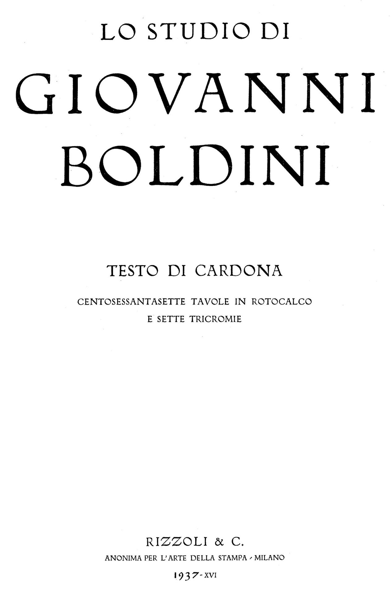 In-4 gr., tela edit. (aloni; risg. rifatti), pp. 38, testo in italiano e francese, con 1 autoritratto del grande artista ferrarese (1842-1931) e 173 tavole fuori testo di cui 7 a colori che riproducono pitture a olio, acquerelli, disegni e punte secche che facevano parte dello Studio Boldini a Parigi, quale fu trovato dopo la sua morte. Bella edizione d'arte.Testo ben conservato. .