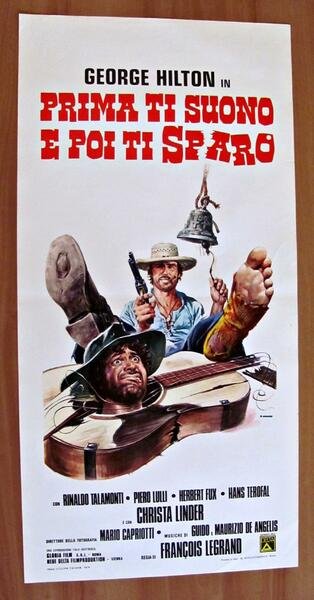 Locandina Originale Prima ti suono e poi ti sparo con George Hilton, Rinaldo Talamonti, Piero Lulli, Herbert Fux, Hans Terofal e Christa Linder. Regia di Francois Legrand. Produzione Italo-Austriaca Gloria Film - I edizione Italiana 1975. 33x70. Stato di Nuovo. , Ottimo (Fine)
