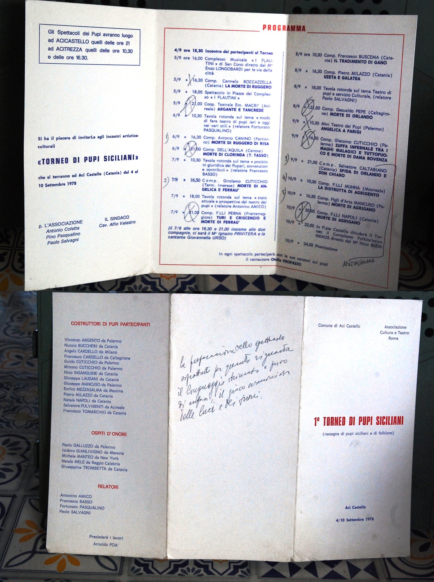 pieghevole locandina primo torneo di pupi siciliani ((con annotazioni dello scrittore salvatore camilleri). 1978 .