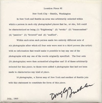 Artist's book in the form of a series of 16 photographs, two maps, text page and printed envelope documenting a mapping piece by Douglas Huebler that took place in New York City, and Seattle, Washington. Originally published as part of the "Artists & Photographs" portfolio. "In New York and Seattle an area was arbitrarily selected within which a person in each city photographed places that he, or she, felt could be characterized as being (1) "frightening" (2) "erotic" (3) "transcendent" (4) "passive" (5) "fevered" and (6) "muffled." Within each area each person made two entirely different sets of six photographs after which all four sets were sent to a third person (the artist) with no information that would make it possible to ken any one of the photographs with any one of the words originally specified. The four sets (24 photographs) were then scrambled altogether and 12 of these arbitrarily selected for this piece; to those were added 4 photographs that had not been made to characterize any kind of place. 16 photographs, a Xerox map of New York and another of Seattle join with this statement to constitute the form of this piece." -- Douglas Huebler, July, 1969. Reference : "Esthétique du Livre d'Artiste 1960 / 1980" by Anne Moeglin-Delcroix. Paris, France : Jean-Michel Place / Bibliothèque Nationale de France, 1997, pp. 152. — F.to: 18x18; BN; rileg. busta. Editore: Multiples, New York, 1970.