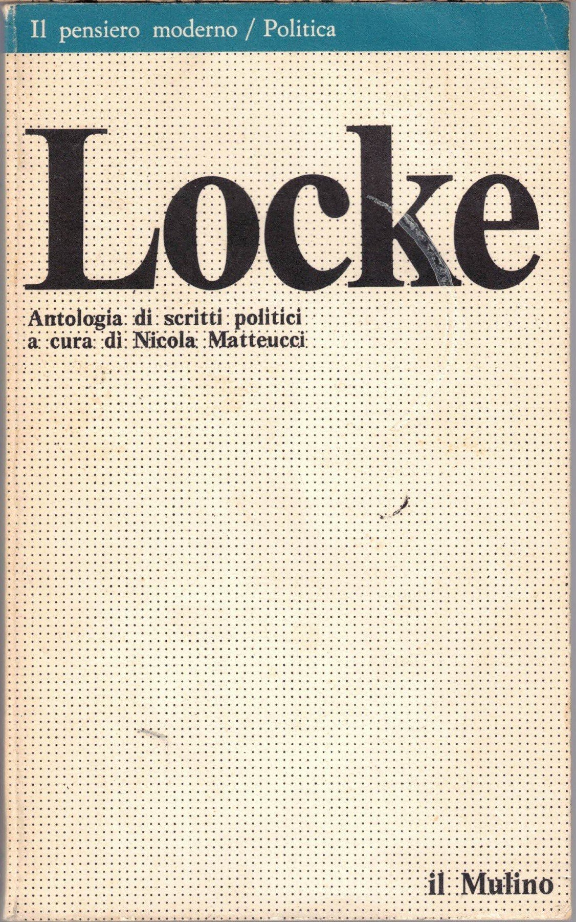 John Locke. Antologia di scritti politici, a cura di Nicola Matteucci, Il Mulino, Bologna 1980, pp. 199, cm 18, br. ed. Collana Il pensiero moderno. Serie Politica, vol. 26. Leggere tracce d’uso alla brossura, alcune ordinate sottolineature a biro alle pagine dell’introduzione, una breve annotazione all’ultima carta di guardia, tenue brunitura della carta, per il resto esemplare ben conservato.