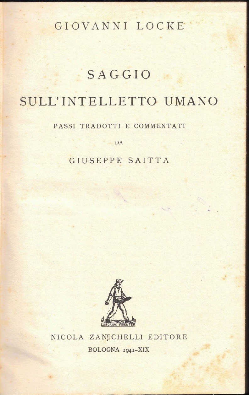 Giovanni (John) Locke, Saggio sull’intelletto umano. Passi tradotti e commentati da Giuseppe Saitta, Nicola Zanichelli Editore, Bologna 1941, pp. XXV, 318, cm 21, legatura coeva in tutta tela blu con titoli e fregi in oro al dorso. Lieve brunitura della carta, leggere fioriture prevalentemente ai tagli, per ilresto ottimo esemplare con legatura solida e interno pulito e assai ben tenuto.