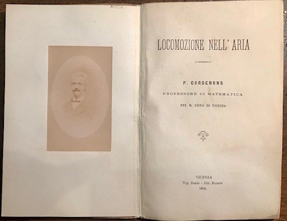 16mo (cm. 18,5), 103(1) pp. Con il ritratto fotografico dell’A. in antiporta. Brossura editoriale (minime tracce d’uso e lieve alone sulla cop. posteriore). Buon esemplare. Rara e curiosa memoria aeronautica. L'A. fu professore di matematica nel Regio Liceo di Vicenza.