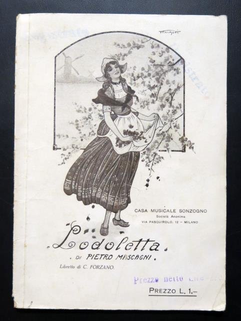 Casa Musicale Sonzogno, Milano, 1917. prima originale edizione. Libretto di C. Forzano per la musica di Pietro Mascagni. In 8vo piccolo, pp. 55, bross. edit. in carta bianca con ill. in grigio illustrata da Marchetti. Usuali ma minimi difetti fisiologici, timbretti di privata appartenenza, buono stato.