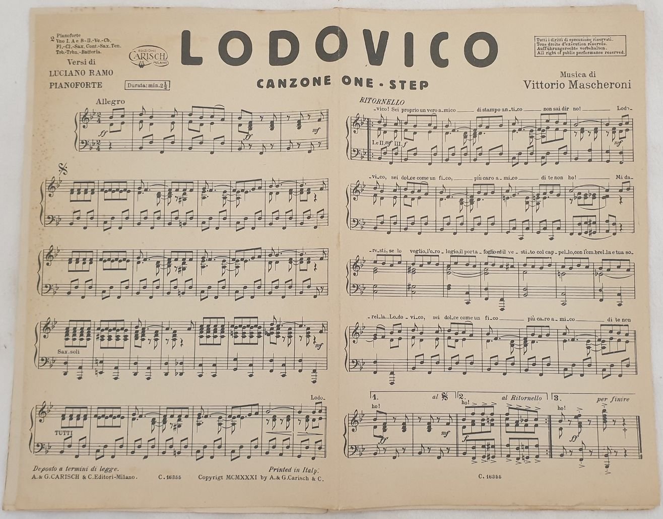 Partitura completa per orchestra del 1931 delle melodie di Vittorio Mascheroni "Lodovico" e di Mario Mariotti "Ma chi è?". Copertina assente. GENERE: One step STRUMENTI: pianoforte, contrabasso, tromba, sassofono, batteria<BR>ANNO: 1931 DIMENSIONI: In 8. cm 27,5x17,5 PAGINE: pp. 22 CONDIZIONI: Discrete condizioni. Ex libris in copertina<BR>Complete score for orchestra of 1931 of the melodies of Vittorio Mascheroni "Lodovico" and of Mario Mariotti "Ma chi è?". Cover lacks. MUSIC: One step STRUMENTI: piano, contrabbass, trumpet, saxophone drums YEAR: 1931 SIZE: In 8. cm 27,5x17,5 PAGES: pp. 22 CONDITIONS: Fair conditions. Ex libris in the cover <BR><BR><BR>