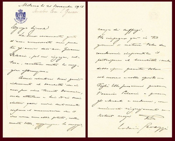 lettera manoscritta e firmata di Lodovico Gavazzi di 2 facciate datata 21 Novembre 1913 su carta intestata "Senato del Regno"; ottimo es.