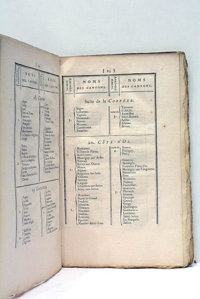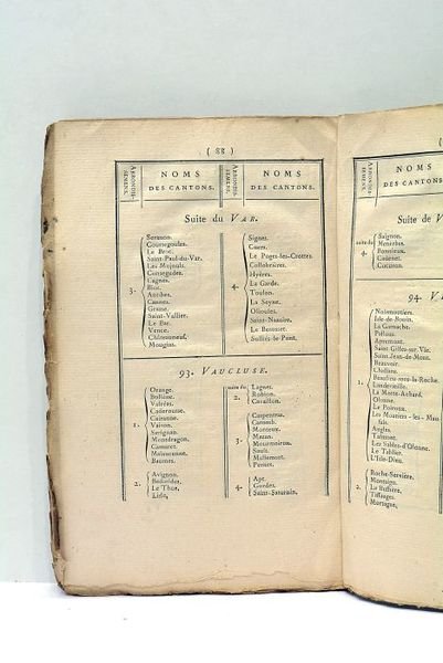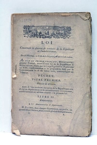 in-8. 94pp. Broché. Non rogné. Feuillets un peu écornés. Salissures et petite déchirure à la page de titre. Première édition. Texte réformateur établi par Bonaparte prévoyant notamment le remplacement des districts par les arrondissements. L'annexe à la loi fixe la liste des départements et des arrondissements.