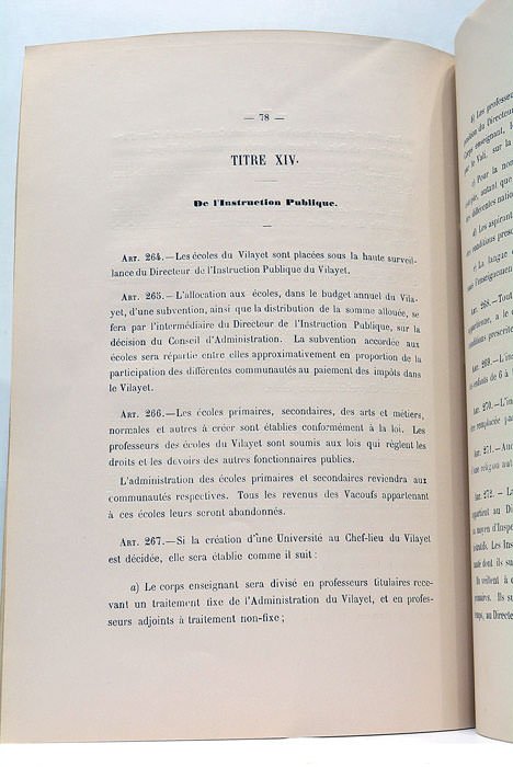 96 pages. (30,5x21 Cm). Broché. Couverture imprimée. Ouvrage très rare, rédigé en Français et imprimé à Constantinople, concernant l'organisation des "vilayets" divisions administratives de la Roumelie, un des territoires de la partie européenne de l'Empire Otoman. Le vilayet de Salonique disparaît en 1912, à la suite de la Première guerre balkanique. Son territoire est partagé entre le royaume de Bulgarie, le royaume de Grèce (qui en obtient la majeure partie) et le royaume de Serbie. Bel exemplaire.