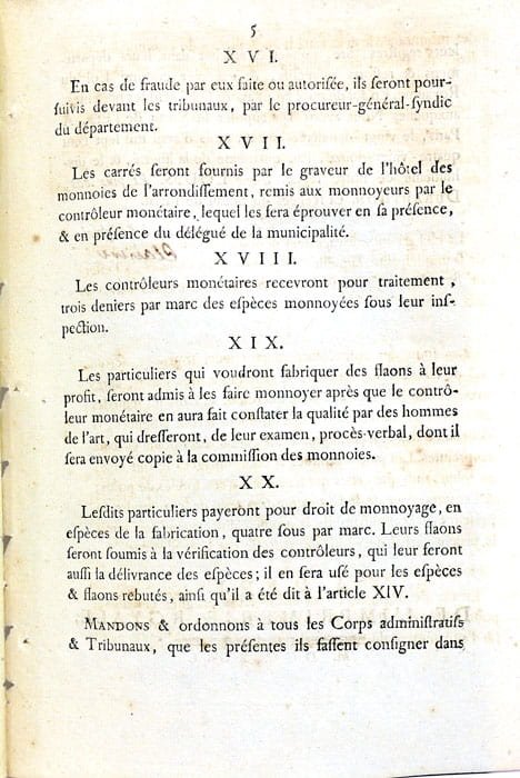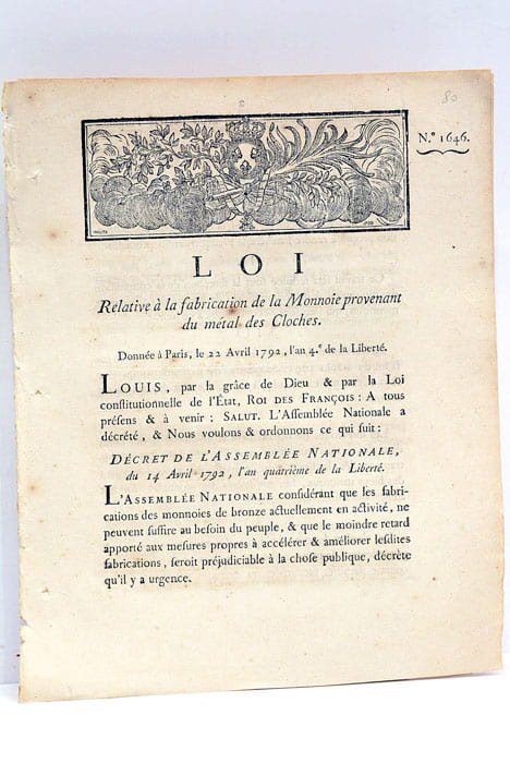 6 pages. (24x19 Cm). Dérelié. Premier feuillet détaché. Loi permettant de couvrir le manque de matière première en bronze pour la fabrication des monnaies par le métal des cloches.