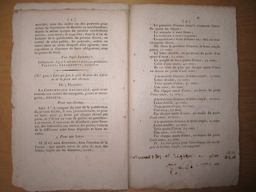 1 brochure in-12, De l'Imprimerie de la République, Paris, an 3 (1795), 8 pp. Etat très satisfaisant. On retrouve la loi du 3 thermidor an 3 fixant le nouveau tarif postal.