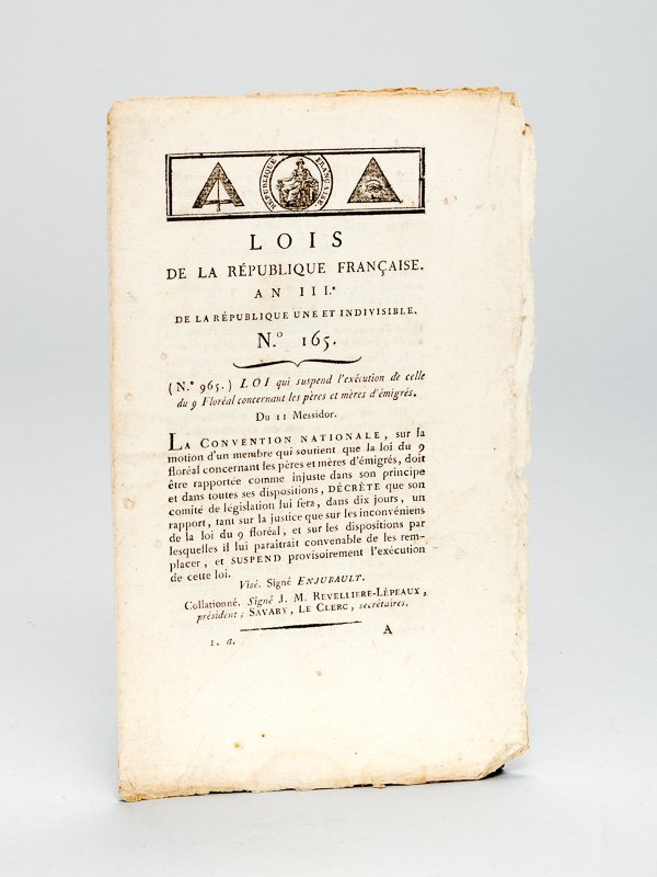 Lois de la République Française An IIIe de la République Une et Indivisible. [ Contient notamment :] Loi qui suspend l'exécution de celle du 9 Floréal concernant les pères et mères d'émigrés - Loi qui fixe le prix du port des lettres et de la poste aux chevaux du 3 thermidor [ Tarif Postal du 21 juillet 1795 ]