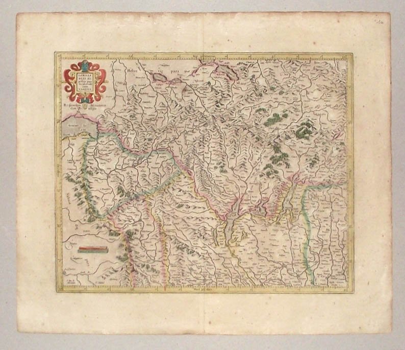 >incisione originale in rame (cm.36,5x45,5 e ampi margini) colorazione coeva. Bella carta che rappresenta il territorio compreso tra la Svizzera e la Savoia. Con lo Stato di Milano, i laghi lombardi, le Valli. Si estende, a Sud, fino al Novarese e a Crema. Tratta dall' ''Atlas Minor'' di J. Hondius e stampato ad Amsterdam dal Jannson nel 1561. Hondius stampo' a partire dal 1606 diverse edizioni di questo atlante rifacendosi al precedente lavoro del Mercator.