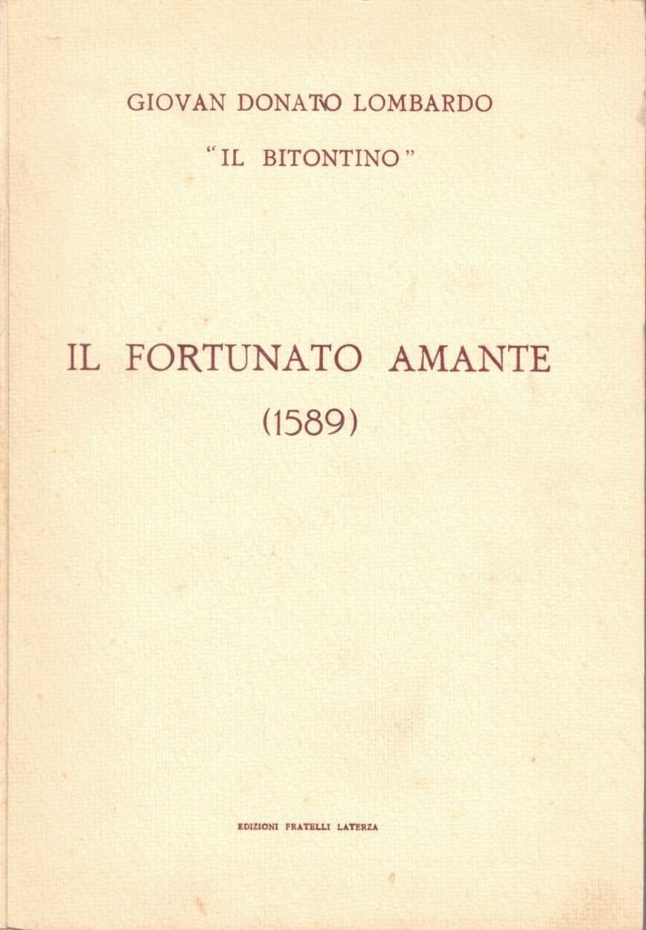 Giovan Donato Lombardo Il Bitontino, Il fortunato amante (1589), saggio introduttivo di Giovanni Attolini, testo e note a cura di Vincenzo Minervini, Edizioni Fratelli Laterza, s.l. (ma stampato a bari, presso la Laterza Litostampa) 1979, pp. 189, cm 24, br. ed. Collana di studi e testi. Minime tracce d’uso alla brossura, per il resto perfetto.