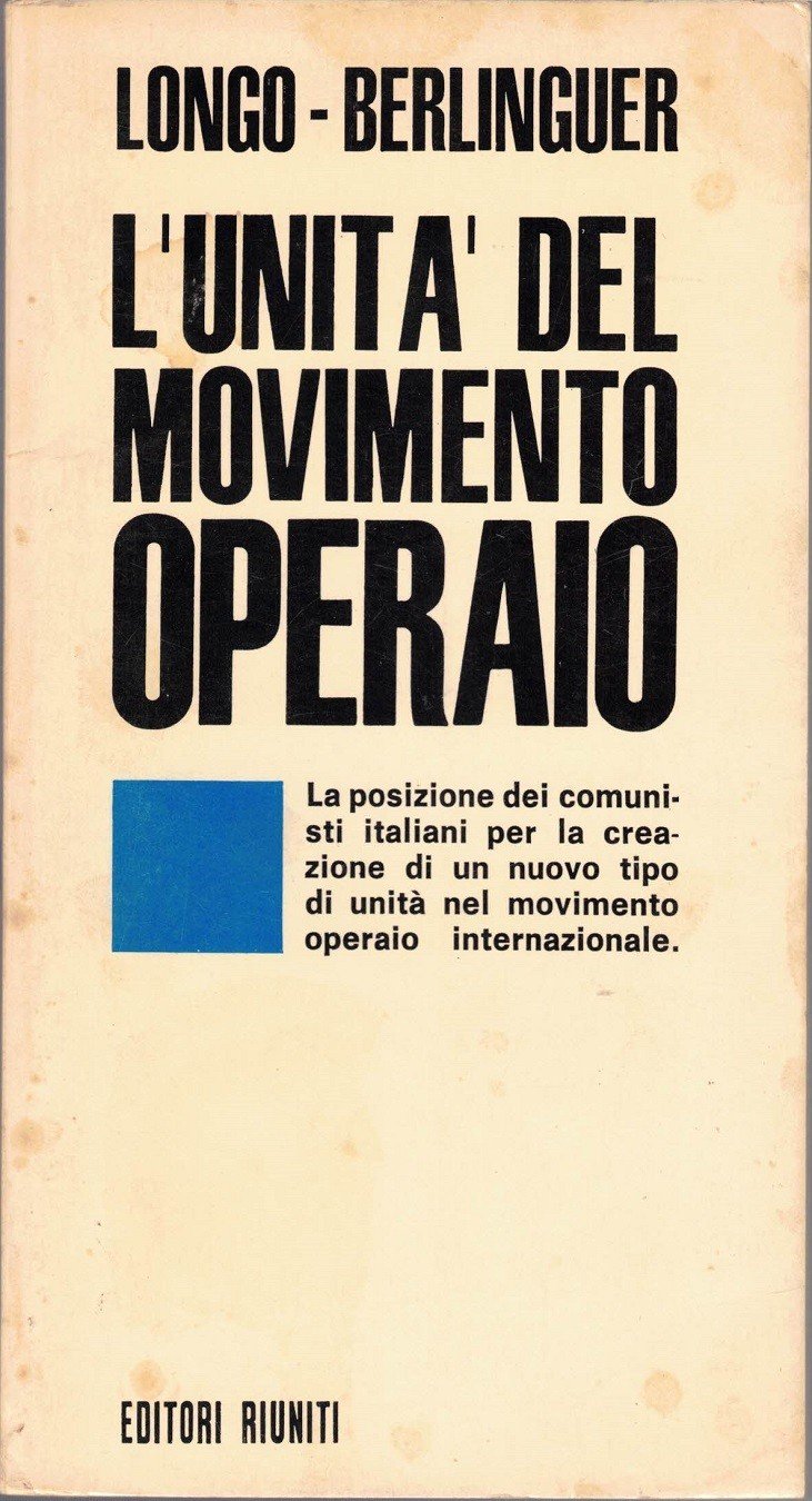 Luigi Longo, Enrico Berlinguer, L’unità del movimento operaio, Editori Riuniti, Roma 1968, pp. 99, br. ed. Collana Il punto, vol. 3 (serie blu). Alla prima di copertina: La posizione dei comunisti italiani per la creazione di un nuovo tipo di unità nel movimento operaio internazionale. Copertina di Giuseppe Montanucci. Leggere tracce d’uso alla brossura, minima brunitura della carta, per il resto ottimo.