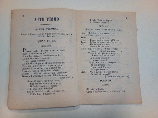 Musica del Cav. Gio. Paccini. Parole di F. M. Piave.<BR>Il vestiario è di proprietà della sartoria Sartori di Bologna. Gli attrezzi sono di proprietàdi Ottavio Cazzani di Bologna. Le scene sono d'invenzione ed eseguite dal prof. Camillo Crespolani coadiuvato dal suo allievo Ferdinando Manzini ambi di Modena. Rammentatore Botti Napoleone. Buttafuori Franchi Giacomo. Macchinista Manzini Giuseppe.<BR>Interpreti: Ortolani Giovanni, Dalla-Costa Cesare, Muzzanti Andrea, Cremont Cecilia, Scandellatri Annunziata, Micheloni Annibale, Giordani Guglielmo.<BR>Cm. 17 x 11; pp. 41; brossura sottilissima con cornicetta tipografica; cucito.<BR>CONDIZIONI MOLTO BUONE: tracce d'uso alla copertina (angoli leggermente piegati; un forellino di tarlo); lieve mancanza all'angolo superiore delle ultime due pagine.