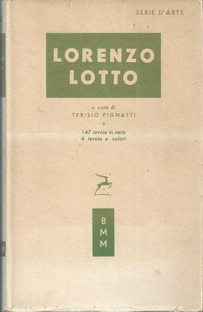 Lorenzo Lotto, a cura di Terisio Pignatti, Arnoldo Mondadori Editore, s.l. (ma stampato presso le Off. Graf. Veronesi dell’Editore Arnoldo Mondadori) 1953, prima ed. B.M.M., pp. 187, ill. b.n., 2 c. di tavv. ill. col., cm 18, cart. ed. con titoli al dorso e al piatto e sovraccoperta. Collana Biblioteca Moderna Mondadori, n. 337. Nuova serie. Leggerissime tracce d’uso alla sovraccoperta, minime fioriture, lievissima brunitura della carta, per il resto molto ben conservato.