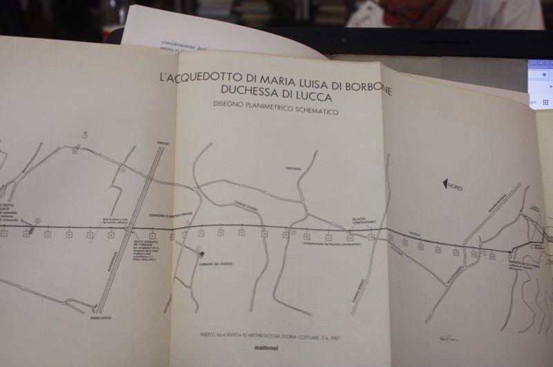 LORENZO NOTTOLINI, A, RIVISTA ARCHEOLOGIA STORIA COSTUME, ANNO XV-1987(aprile-dicembre), 8° bross. edit. sovrac. pp. 200, molte ill. nel testo e una carta ripieg. Numero speciale per il 2° Centenario della nascitaAltra impresa di grande rilevanza è l'Acquedotto (1823 - 1851), opera ancora esistente nella sua monumentalità (anche solo parzialmente funzionante)[2] che portava all'interno della città di Lucca l'acqua dei Monti Pisani con condotte sospese su oltre 400 archi (alla maniera romana) per oltre tre chilometri. Il tratto sopraelevato è compreso fra la presa (oggi visibile dell'area di rispetto dell'acquedotto monumentale, nella frazione di Guamo) e il tempietto cisterna di San Concordio, a pochi metri dalle mura di Lucca. Purtroppo la continuità delle arcate viene interrotta per la lunghezza di 6 archi per consentire il passaggio della autostrada A11. Ad oggi le acque non scorrono più sulle condotte sospese sugli archi ma sono interrate e convogliate al di sotto dell'Acquedotto stesso. I tempietti hanno l'aspetto neoclassico a pianta circolare. Dalla cisterna di San Concordio un condotto sotterraneo in ferro (un progresso notevole per l'epoca) conduce in città fino alla fontana di fianco al Duomo, per circa 7-800 metri, poi alle altre fontane, alcune progettate dallo stesso Nottolini