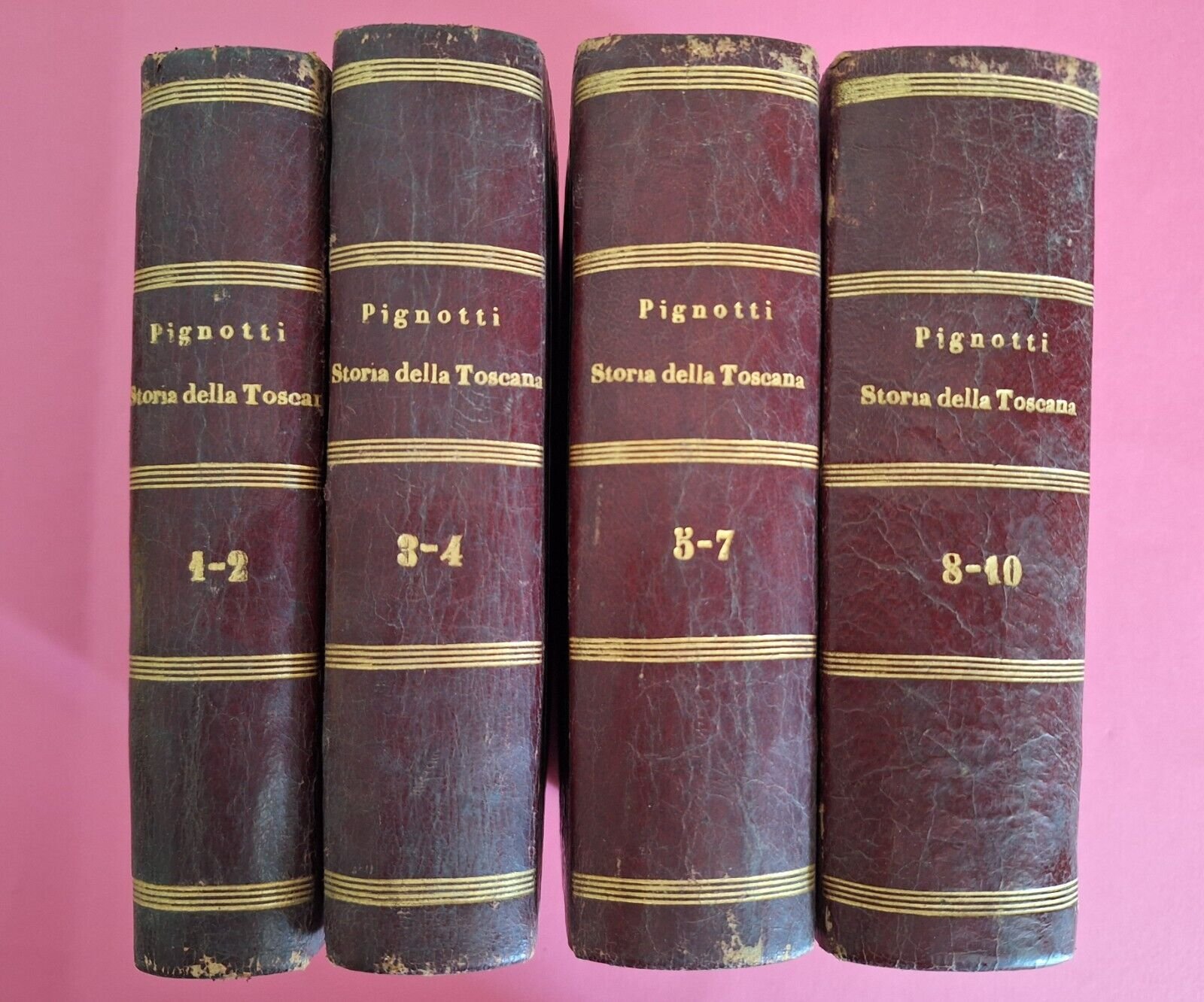 LORENZO PIGNOTTI STORIA DELLA TOSCANA PISA PRESSO N. CAPURRO 1815 In 12°, 10 volumi in 4 tomi, legatura in mezza pelle con titolo in oro al dorso, antiporta al primo volume.Lievissimi segni alle legature, pagine fresche e pulite.