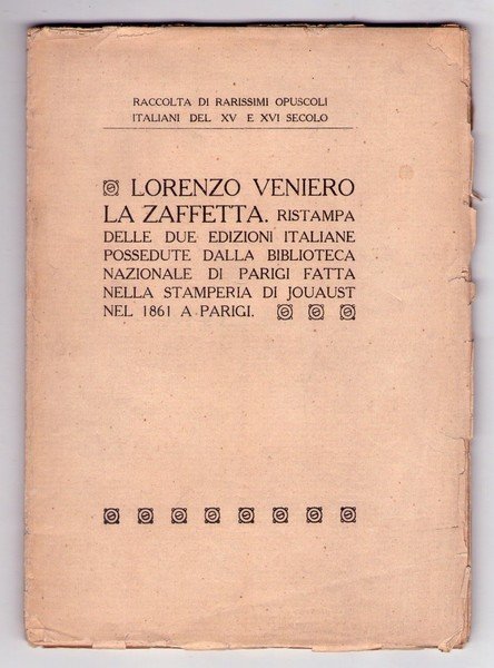 LORENZO VENIERO. La Zaffetta. Ristampa delle due edizioni Italiane possedute dalla Biblioteca Nazionale di Parigi fatta nella stamperia di Jouaust nel 1861 a Parigi.