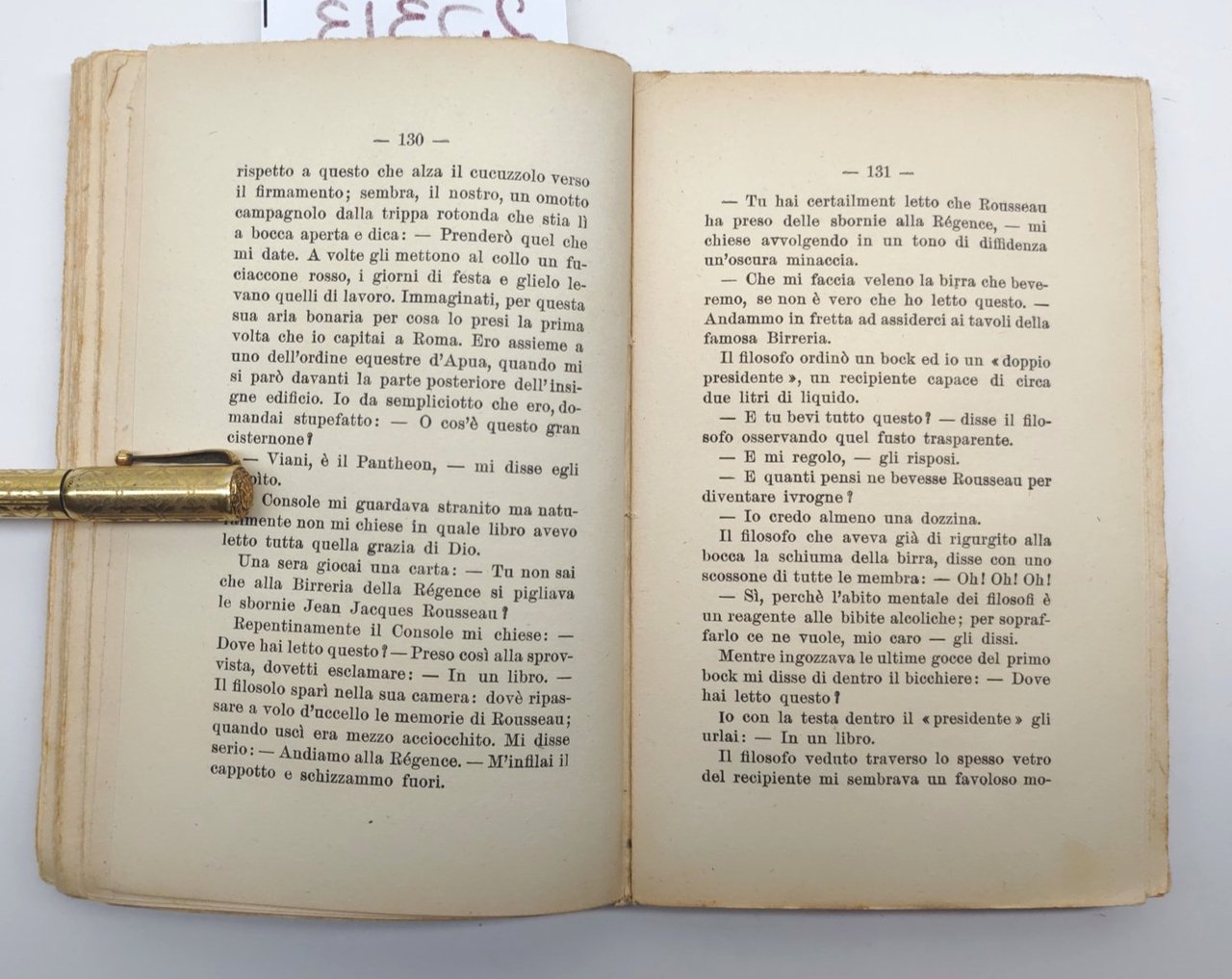 in precarie condizioni, legatura morbida editoriale con firma di possesso al piatto anteriore, uno strappo di centimetri 3 al margine superiore del piatto anteriore, vedere immagini, dorso con pieghe di lettura e abrasioni ai margini, quarta di copertina con aloni e sporcizie, tagli irregolari bruniti con fioriture, lieve brunitura al margine esterno delle pagine, legatura leggermente allentata, da pagina 67 pagina 78 a fogli sciolti, vedere immagini, numero pagine 233 dimensioni cm 19,1 x un 12,5 * 2,1