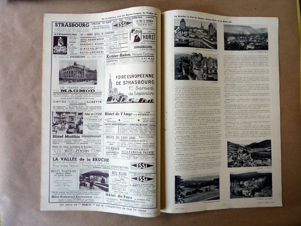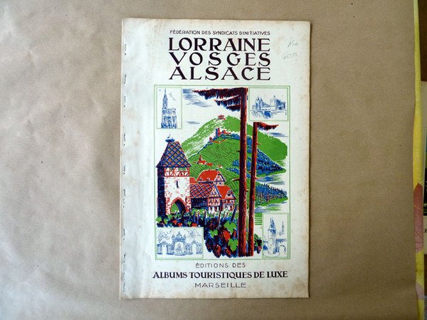 Une revue bilingue, français-anglais; de format in folio (30x44cm) de 38 pp.; une carte de la Lorraine, des Vosges et de l'Alsace et plusieurs centaines de photographies en noir de sites remarquables. Nombreuses pages d'annonces publicitaires, de "réclames,"répertoriant tous les grands restaurants de l'époque, les "tour operator", les commerces de luxe les possiblilités sportives et tous les Syndicats d'Initiatives. Couverture en 4 couleurs de Rob D'Ac (Robert Gaston Menot). Rob D'Ac (Robert Gaston Menot), gazé pendant la guerre 14/18, s'installa à Grenoble et produisit de nombreuses affiches pour de grandes firmes; Air-France; Arthaud, Berliet, British Petroleum, Merlin-Gerin, Petit-Bateau; mais aussi pour la Ligue contre Le cancer. Il dessina également des affiches touristiques de 1932 à 1938 pour la Fédération des Syndicats d'Initiatives. Quelques rousseurs sur la couverture, intérieur frais. La revue est agrafée. La couverture, vue son format, pouvait servir d'affiche.