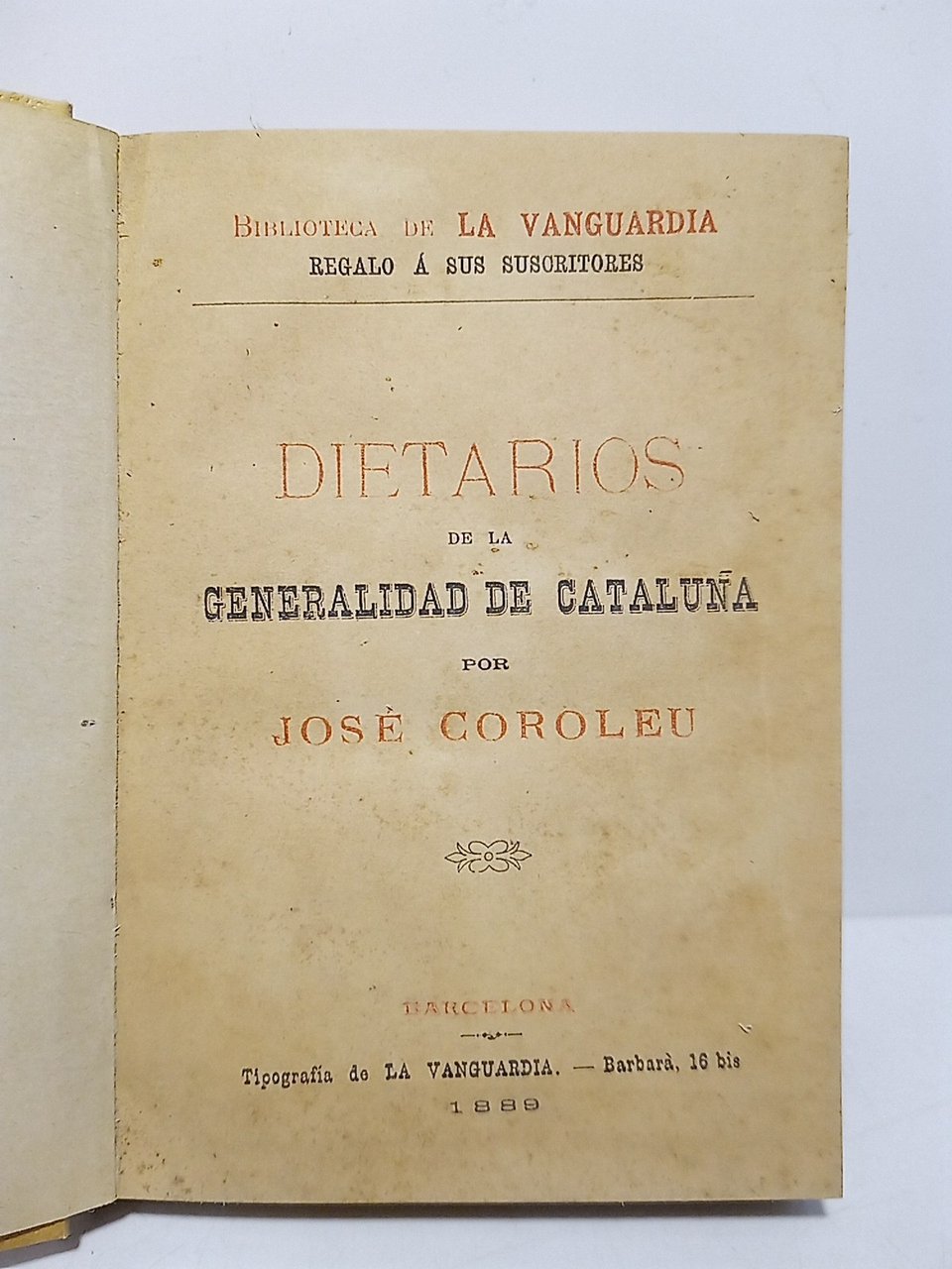 Barcelona: Tip. de La Vanguardia, 1889.- 336 p.: Ilustraciones intercaladas entre el texto; 8° menor (16,2 x 11,9 cm); Cartoné Ed. moderno en imitación tela, conservando las cubiertas originales.- (Bibl. de La Vanguardia).- Abarcan desde 1412 hasta 1598.* HISTORIA DEL SIGLO DE ORO ESPAÑOL