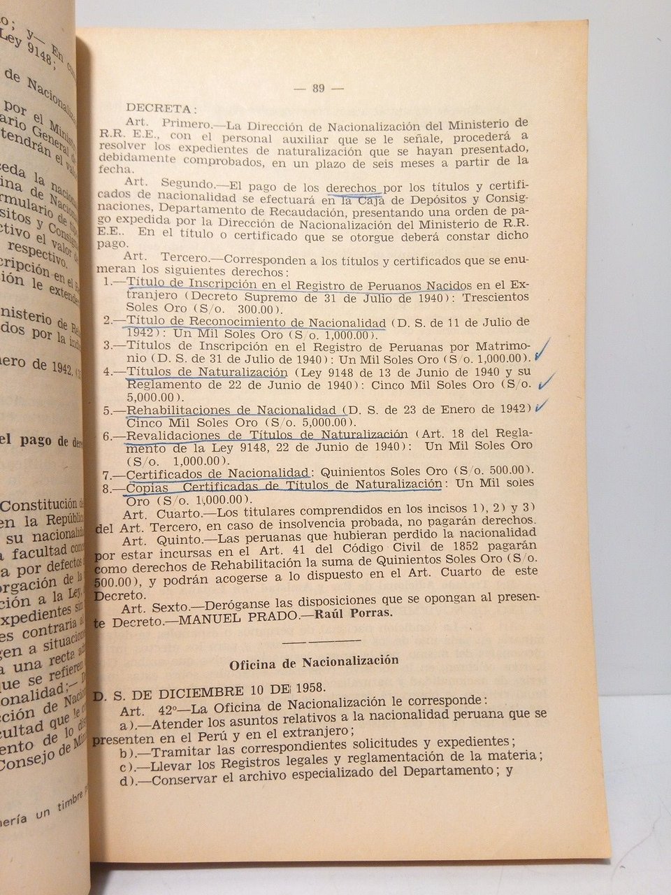 Lima: [s.n.] Imp. Talleres Offset "La Confianza", [ca. 1960].- IV,519 p.; 4º (24 x 17,2 cm); Cartulina Ed.* Algunas páginas con parte del texto subrayado. La portada y la última hoja tienen señales del papel celofán con el que se debió fijar un forro, así como en ambas tapas unas. Los cuadernillos del libro van cosidos con 3 grapas metálicas. DERECHO IBEROAMERICANO