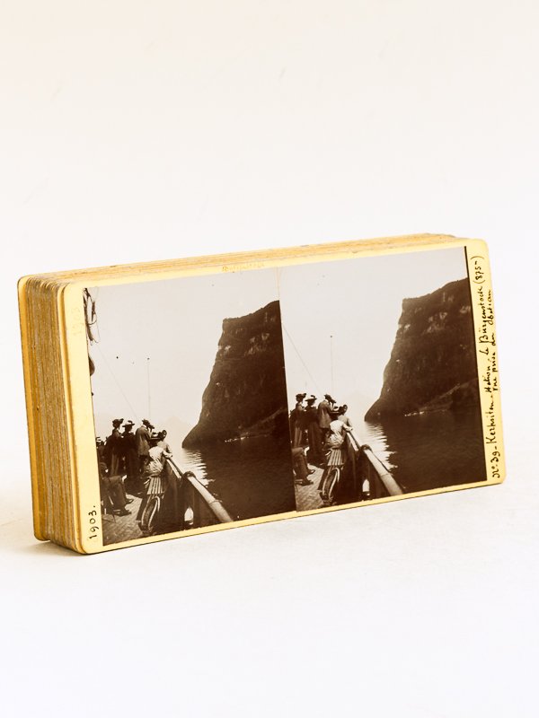 17 vues stéréos format 17,6 x 8,6 cm, tirage albuminés, Famille Rodot, 1903. Rappel du titre complet : Lot de 17 vues photographiques stéréoscopiques d'un voyage en Suisse en 1903 [ Tirages originaux ] Numéros 18 : L'Axenstrasse, Lac des 4 cantons, La sortie du tunnel (vers Flüchen) - 39 : Kerksiten, Le Bürgenstock Vue prise du bateau - 43 : Vue prise du sommet du Burgenstock (875m) Lac des 4 cantons, Anse de Küssnacht, Weggis et le Rigi Kuhn - 45 : Route du Saint Gothard de Goeschenen à Andermatt, La gorge des Schoellenen (vers Goeschenen) - 48 : Route du Saint Gothard de Goeschenen à Andermatt, La chute de la Reuss au trou d'Uri (vers Andermatt) - 66 : Schaffhausen, La chute du Rhin, Vue prise du château de Lauffen - 73 - Interlaken. Le Mönch et la Jungfrau, Vue prise du village d'Unterseen - 74 : Interlaken. Le Mönch et la Jungfrau, Vue prise du cimetière d'Unterseen - 77 : Engelberg, Ascension du Titlis, Le départ de la caravane - 79 - Engelberg, Ascension du Titlis, Vue prise de la Rothegg 2903 m - 80 : Engelberg, Ascension du Titlis, Vue prise de la Rothegg 2903 m Caravane se remettant à la corde - 82 : Engelberg, Ascension du Titlis, Vue prise de la Rothegg 2903 m Grandes crevasses du glacier du Titlis - 83 : Engelberg, Ascension du Titlis, Vue prise de la Rothegg 2903 m - 85 - Engelberg, Ascension du Titlis - 86 : Ascension du Titlis près Engelberg, Descente de la caravane et retour à Engelberg - 86 Ascension du Titlis près Engelberg, Descente de la caravane et retour à Engelberg, Georges, M. Rodot, Gustav Hess et Feierabend - 93 : Ascension du Titlis