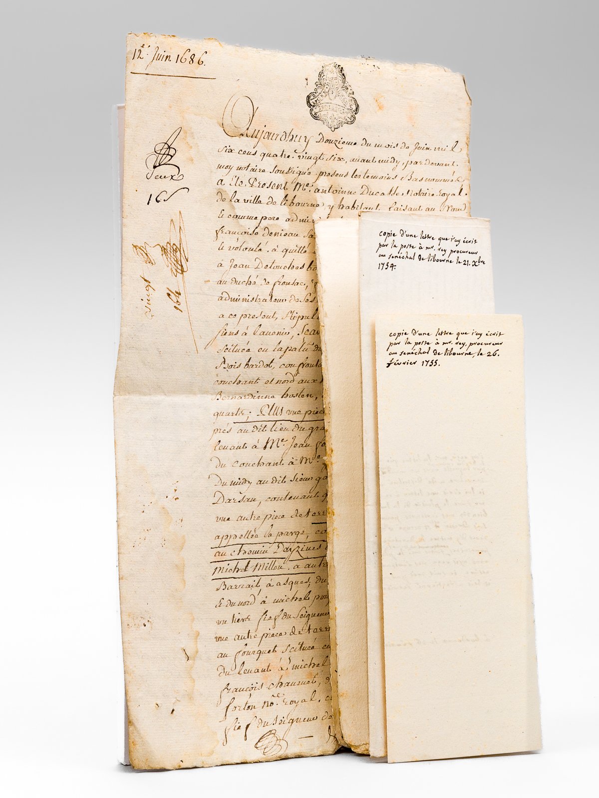 3 documents manuscrits à savoir : 1 document manuscrit signé de 2 ff. in-folio ( 38 x 25 cm), 2 pages et demie manuscrites : Copie par Jean-Baptiste Michel de Montaigne d'une lettre "que j'ay écrit par la poste à Mr. Rey procureur au sénéchal et présidial de Libourne, à Libourne". "A Bordeaux, le 21 décembre 1734, Le désir que j'ay, Mr, d'apprendre quel est l'état de vôtre santé, m'engage de vous prier de vouloir bien le faire le plaisir de m'en donner des nouvelles ; je souhaiterois de tout mon coeur trouver des occasions pour vous donnner des marques que personnes ne sçauroit s'intéresser plus particulièrement que moy à tout ce qui vous regarde, soyés en je vous prie bien persuadé. J'eusse fait dresser ma réponse aux blâmes que le Sr [ . ] a fourni contre mon dénombrement si j'avois eu en main certaines pièces qu'on m'a promis de me communiquer, je serai bien aise dd'avoir par devers moi ces pièes avant de répondre à ses blames, je compte les avoir bien-tôt. Je vous ay marqué, par la lettre que je vous écrivis le 7 du mois d'août dernier, que le Sr [ . ] avait en son pouvoir la baillette à fief nouveau de ma maison de Beausoleil du 14 may 1597 retenuë par papier notaire royal, c'est de quoi je suis assûré [ . ]" [ . ] "Le Sr [ . ] ne voudra pas contester apparemment que l'énonciation de ce bail à fief de 1597 dans le dénombrement de 1691 et dans la sentence de sa réception, contradictoirement renduë par le Sénéchal de Fronsac le 15 juin 1691 entre feu M. le Duc de Richelieu et feu M. François de Montaigne, ne fasse foy suffisante ; il est de maxime en droit que les énonciations dans les anciens actes font foy sans rapporter l'acte énoncé, il faut d'ailleurs tenir pour constant que le rapport du titre primordial n'est pas nécessaire quand on produit et rapporte un dénombrement fait authentiquement et énonciatif de ce titre primitif, lequel dénombrement équipolle au premier titre quand il ne paroit pas, le remplace et en fait l'office étantune confirmation, un renouvellement bien exprès de l'ancienne inféodation." [etc. ] |On joint : ] Copie par Jean-Baptiste Michel de Montaigne d'une lettre "que j'ay écrit par la poste à Mr. Rey mon procureur au sénéchal de Libourne", à Bordeaux le 26 février 1733, 1 feuillet format 20,2 x 16,3 cm (même affaire) [ On joint une copie authentique établie en 1762 d'un acte de juin 1686 ] : ] Acte daté de 1761 de la généralité de Bordeaux fait par Notaire Royal et retiré "par Messire Jean-Baptiste Michel de Montaigne Chevalier Seigneur de Beausoleil, ancien premier jurat de Bordeaux, y demeurant dans son hôtel rue Dumirail [ du Mirail ] Paroisse St Eloy sans avoir icy ajoutté ny diminué, fait à Bordeaux dans l'hôtel de ce Seigneur l'an mille sept cens soixante deux le treize du mois de mars et signé" (copie d'un contrat de délaissements de certains pièces de terre par Antoine Ducasse notaire royal en faveur de Jean de Louche batelier, vers le grand Barrail). Acte signé par Montaigne, David, Robin, etc. Très intéressante réunion de 3 documents manuscrits, les deux premiers rédigés et signés et le dernier signé par Jean-Baptiste-Michel de Montaigne (1701-1764) chevalier seigneur de Beausoleil et qui fut premier jurat de Bordeaux. On retrouve sa trace dans le "Livre des Bourgeois" de Bordeaux, à la date du 3 août 1761, où il justifie "descendre de Grimon Deyquem, Seigneur de Montaigne, qui fut maire de la ville de Bordeaux en l'année 1585, et dont la qualité de bourgeois fut vérifiée au tableau de 1663 en faveur de Guillaume, seigneur de Bussaguet". Il demeurait à Bordeaux dans son hôtel de la rue du Mirail, paroisse de Saint-Eloi, comme le précise le dernier document.