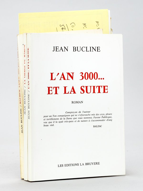3 vol. petit in-8 br., Les Editions La Bruyère, 1990 Bon ensemble réunissant les trois ouvrages publiés en 1990 par Jean Bucline (Jean Larue), le fils du peintre impressionniste Maurice Larue (lui-même oncle du peintre Jean-Gabriel Domergue). Lui-même poète, voyageur, inventeur (du "gyravion"), Jean Bucline s'occupa pendant 20 ans de la "Maison Larue", maison de haute couture fondée en 1898 par sa mère Blanche, installée à Biarritz et Bordeaux, et fournisseur avant-guerre de la reine d'Espagne. Les 3 livres sont dédicacés à l'écrivain bordelais Michel Suffran, et l'on joint une carte et une belle lettre autographe signée de l'auteur, évoquant ses efforts pour la mémoire de son père, ainsi que plusieurs documents et coupures de presse ou notes de Michel Suffran relatives à l'ouvrage et à l'auteur. Bel ensemble.