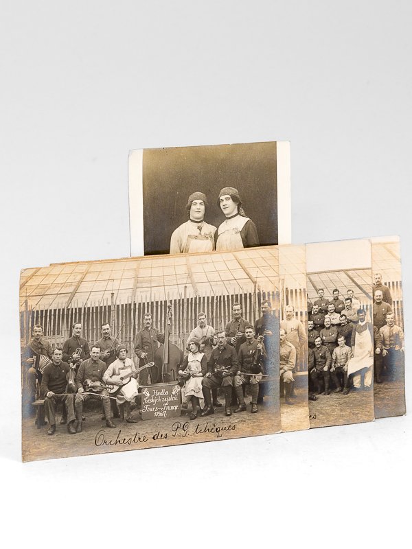 5 cartes postales annotées au verso, lot de 5 cartes postales annotées : Prisonniers tchèques [ Souvenir des prisonniers tchèques St Pierre des Corps le 8 janvier 1918 ] - Cercle de théâtre des P. G. Tchèques - Orchestre des P. G. Tchèques - Volontaires tchèques [ Souvenir des prisonniers tchèques St Pierre des Corps le 8 janvier 1918 ] - [ 2 Soldats travestis pour le théâtre : Souvenir de Bohumil Kumbera et Joseph Hanton, P.G. Tchèques St Pierre des Corps le 8 janvier 1918 ] Très intéressant ensemble, daté et situé. Prix du lot, non séparable.